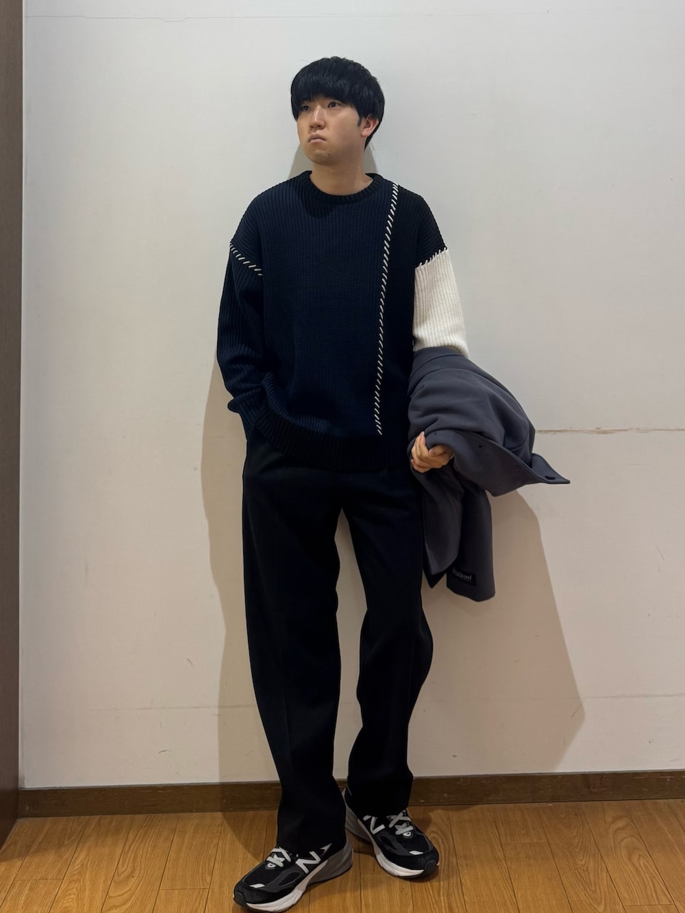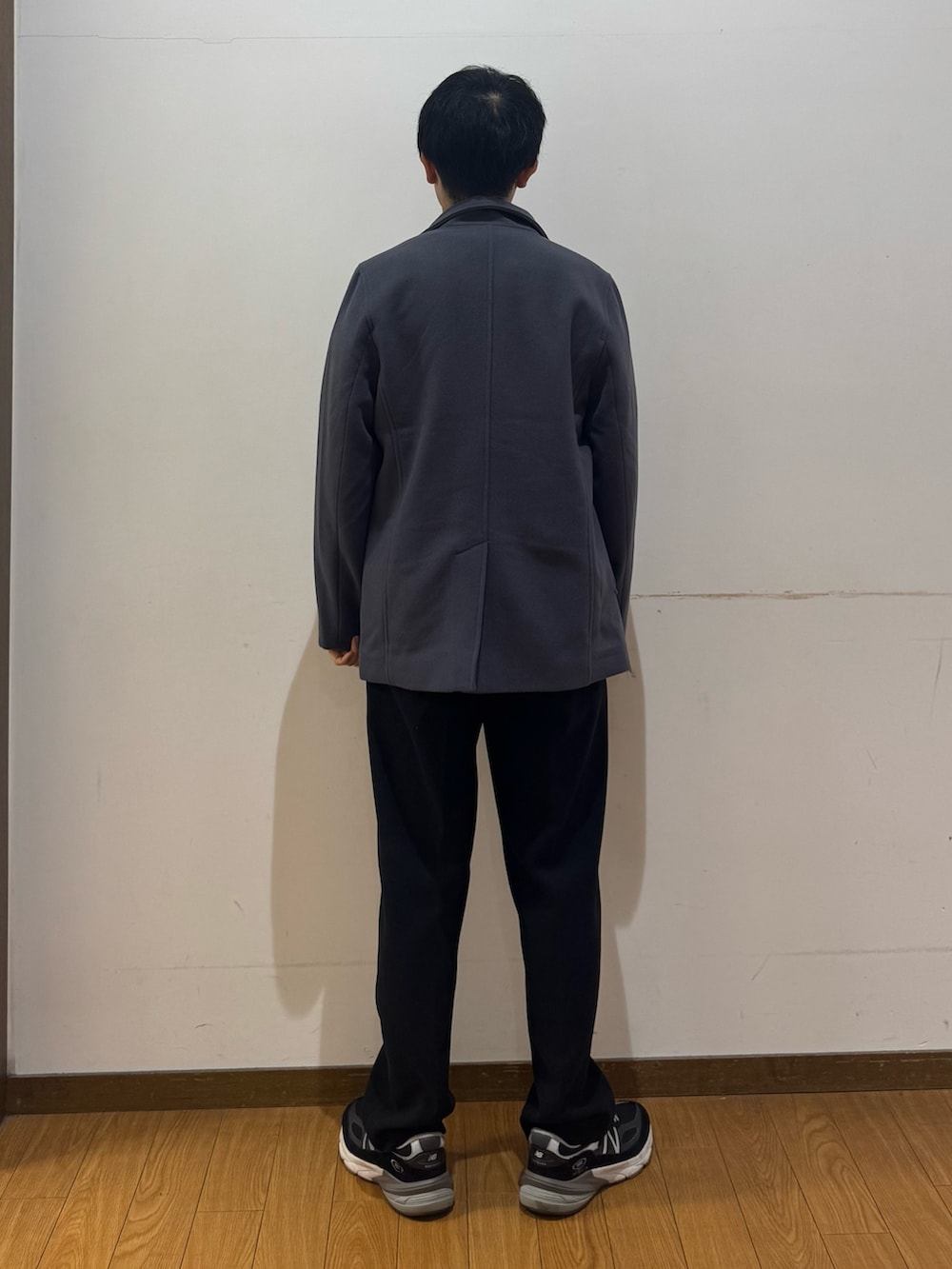 ニットがカジュアル感かなり強めになるので、抑えめな色で、ジャケットと合わせました。