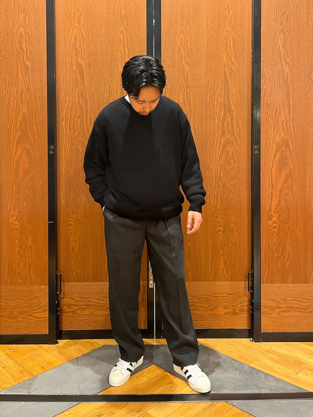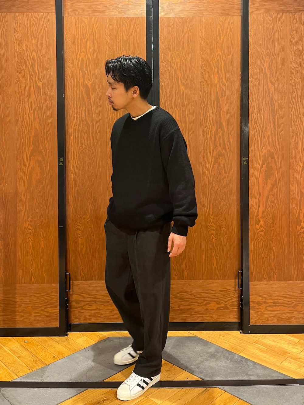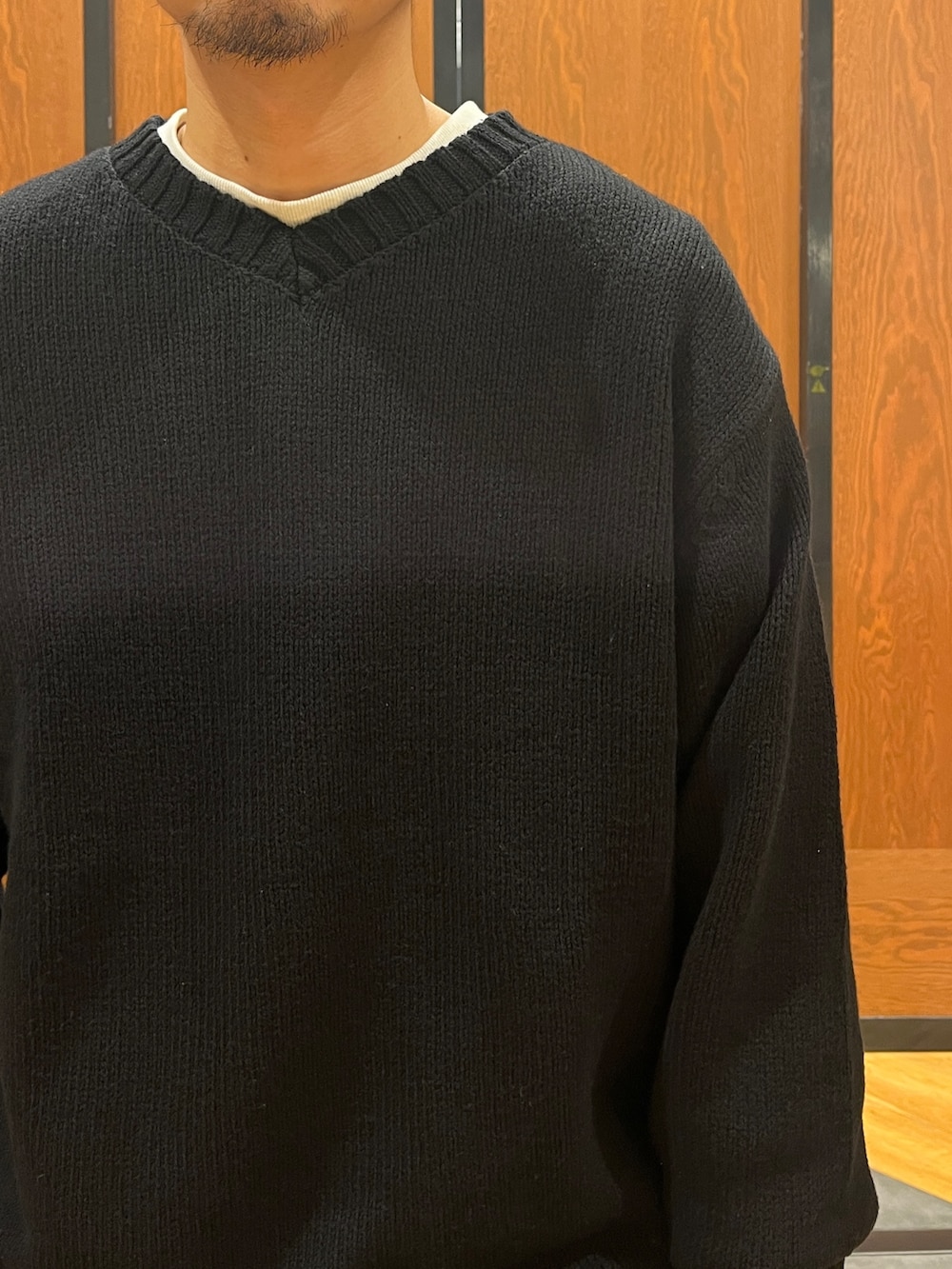 FORK&SPOONのVネックニットオススメです。ゆったりしたサイズ感が良く、ざっくりした生地感と浅めのVネックが大人感を出してくれます。
