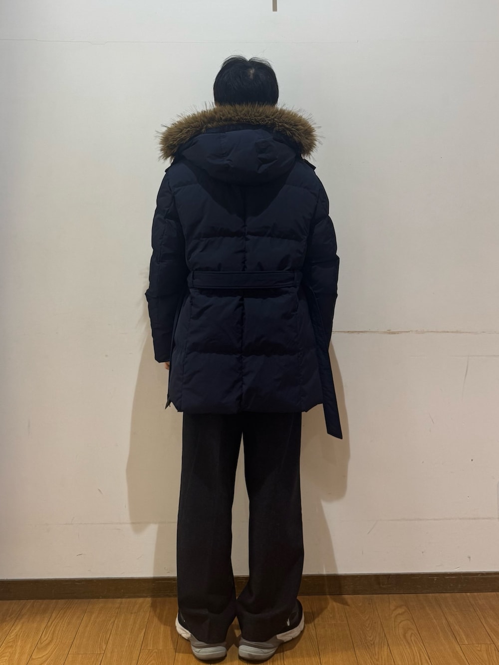 セミロングのコートになっており、ベルトを結んでいただくと体にフィットしたサイズにできます