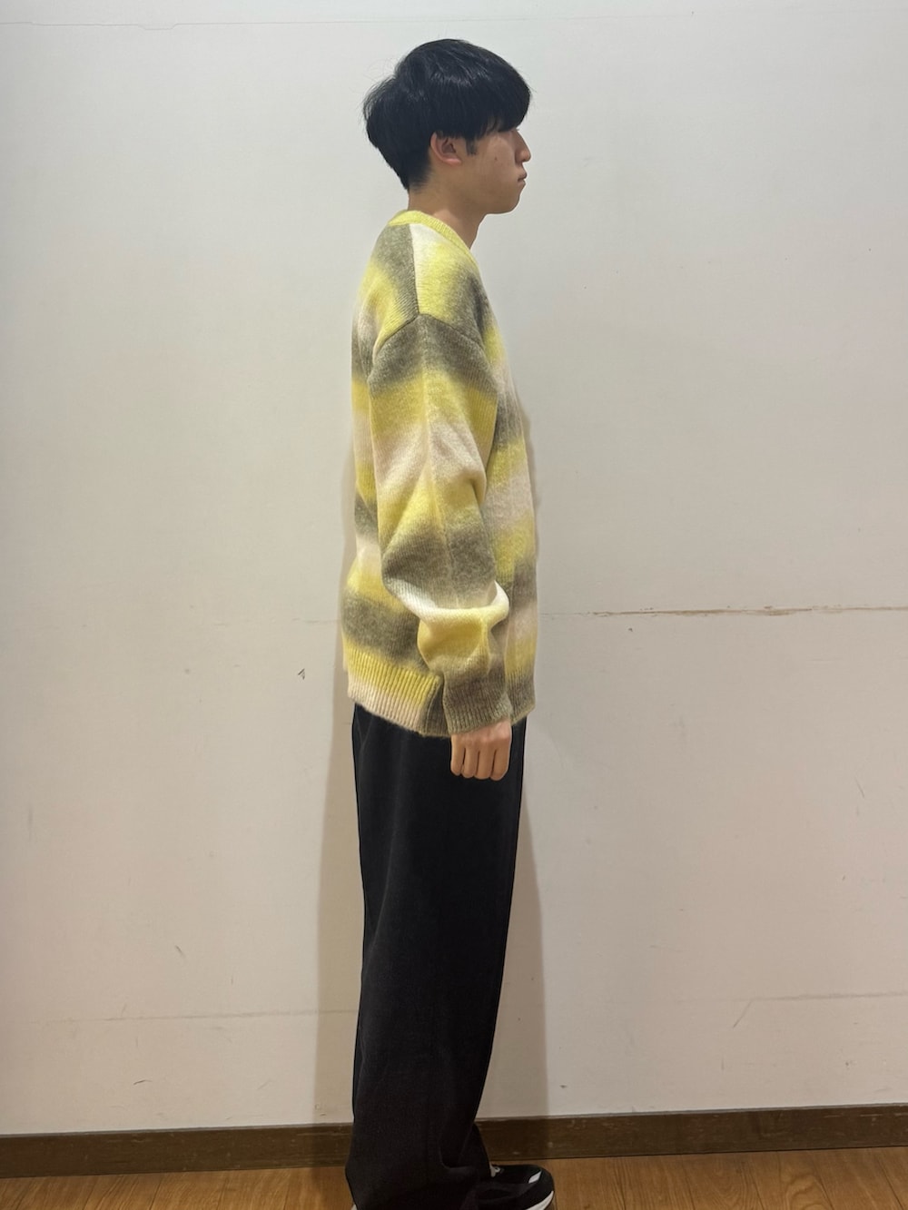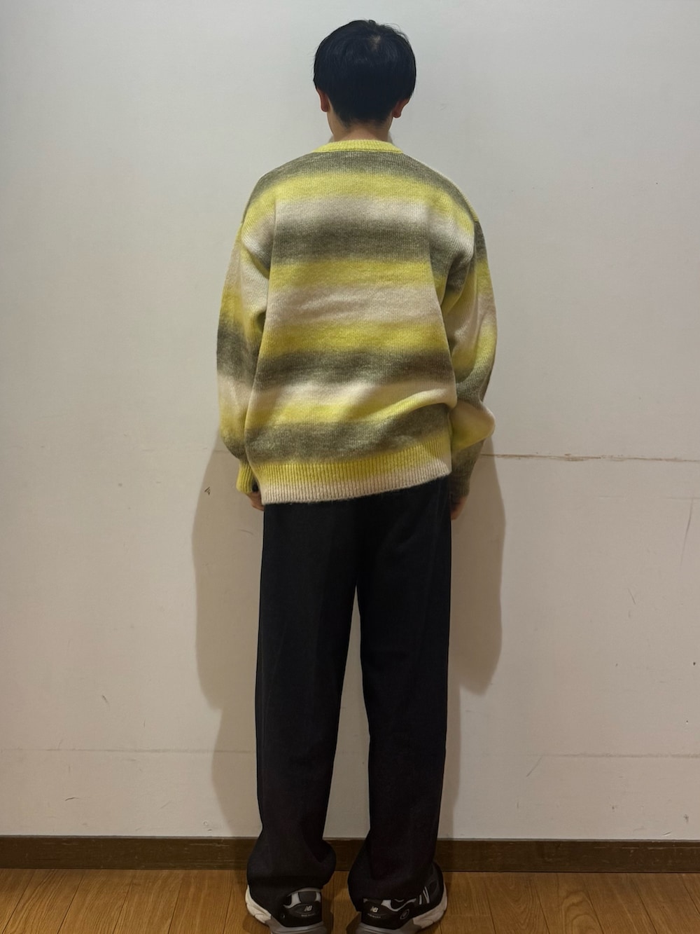グラデーションニットにウールのパンツを組み合わせました。