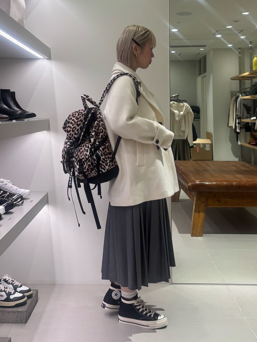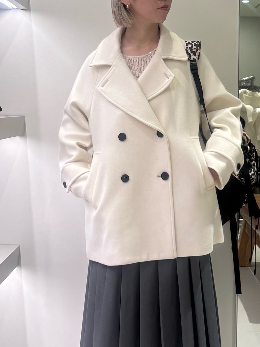 合わせやすいミドル丈で、袖を通すと本当に軽いです。ワンサイズですが、幅広い身長骨格の方に似合う形。