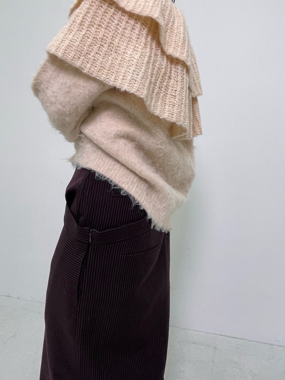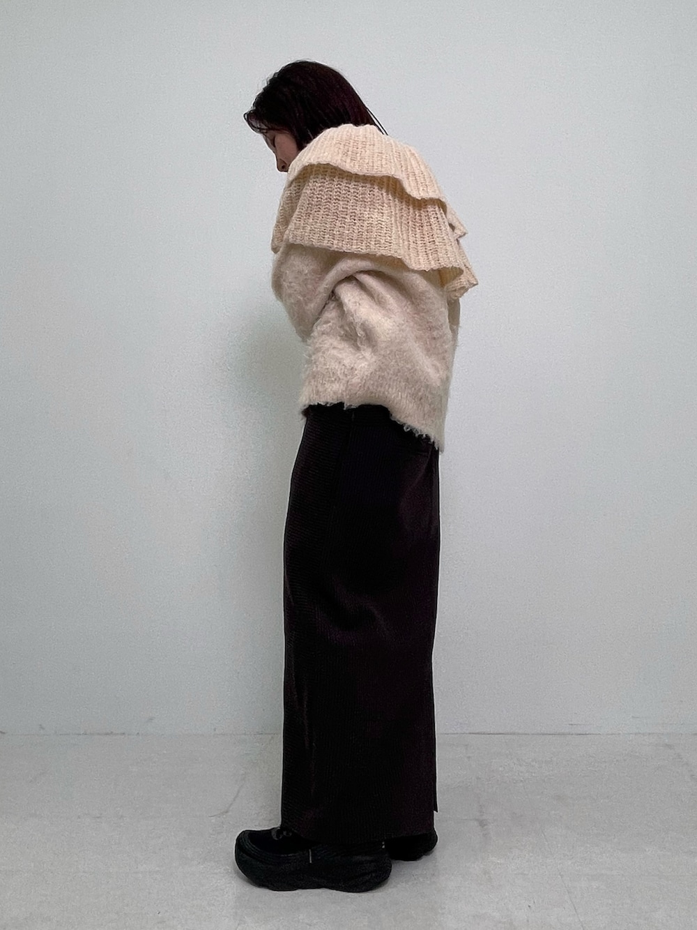 トップスがボリュームあるのでボトムはスッキリなlラインのスカート合わせ◯