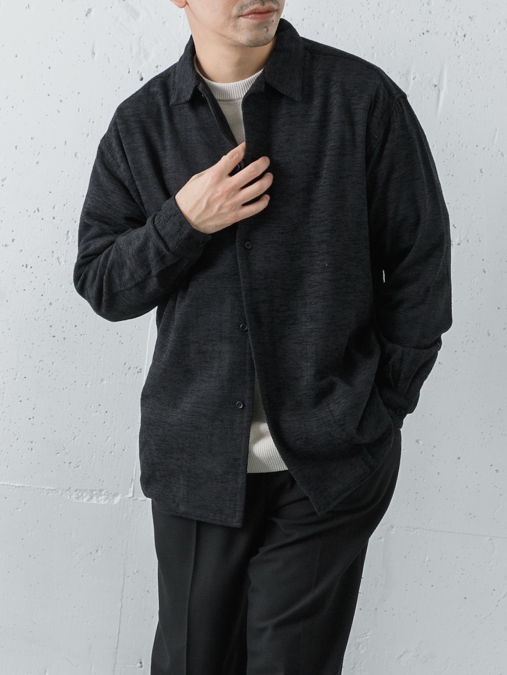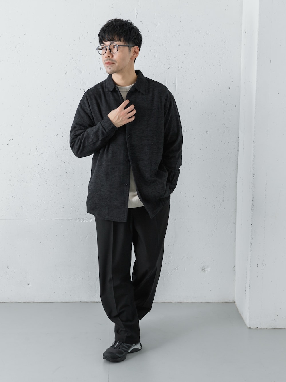 上半身はモール素材のニットとシャツを組み合わせて生地感に統一感を出しました。