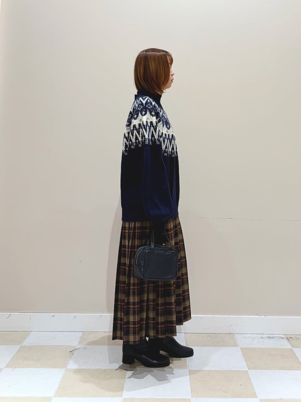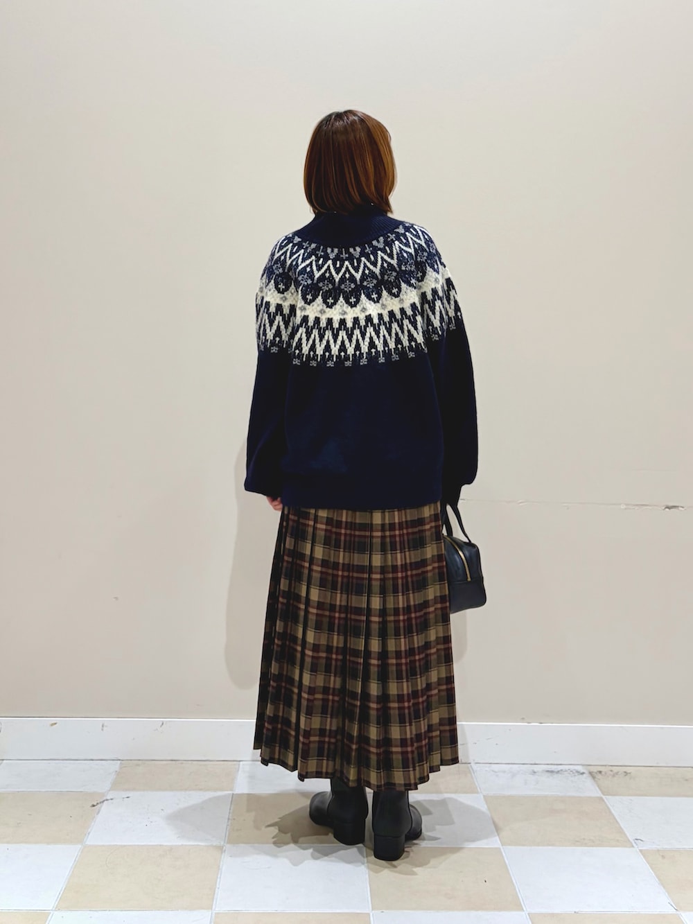 冬っぽい雰囲気のノルディック柄が目を惹くニットにチェックプリーツスカートとブーツでゆるっとしたトラッドスタイルに。