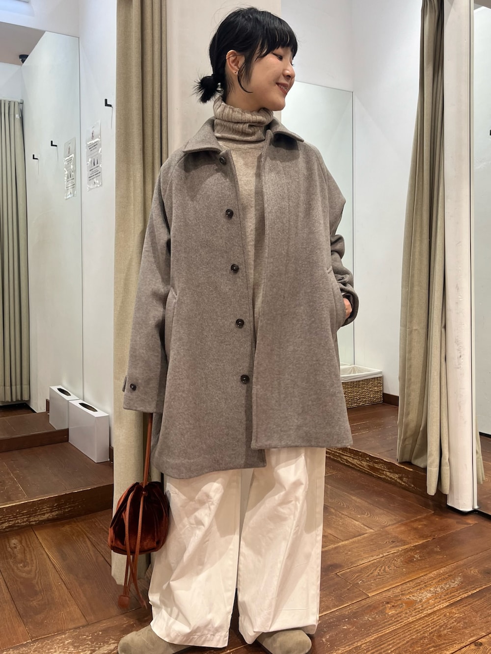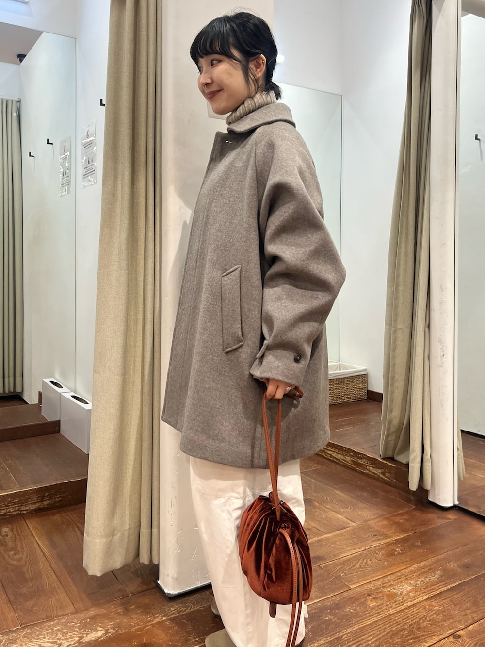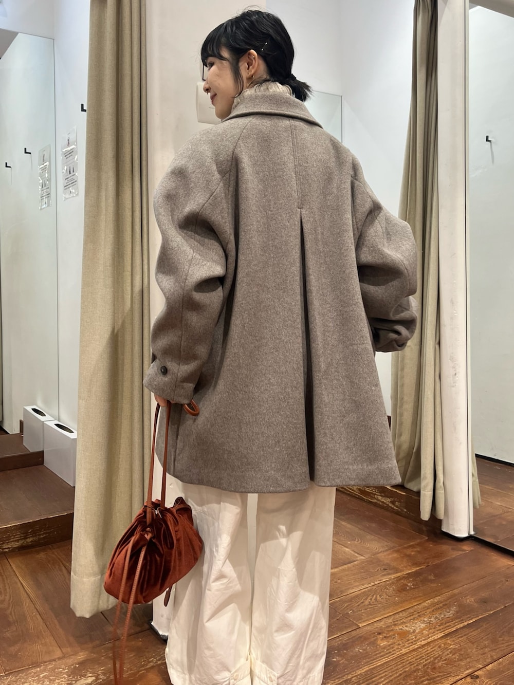 ニットと同系色のウールバックタックショートコート。ざっくり入ったタックが女性らしいスタイルにしてくれて可愛いです🧥