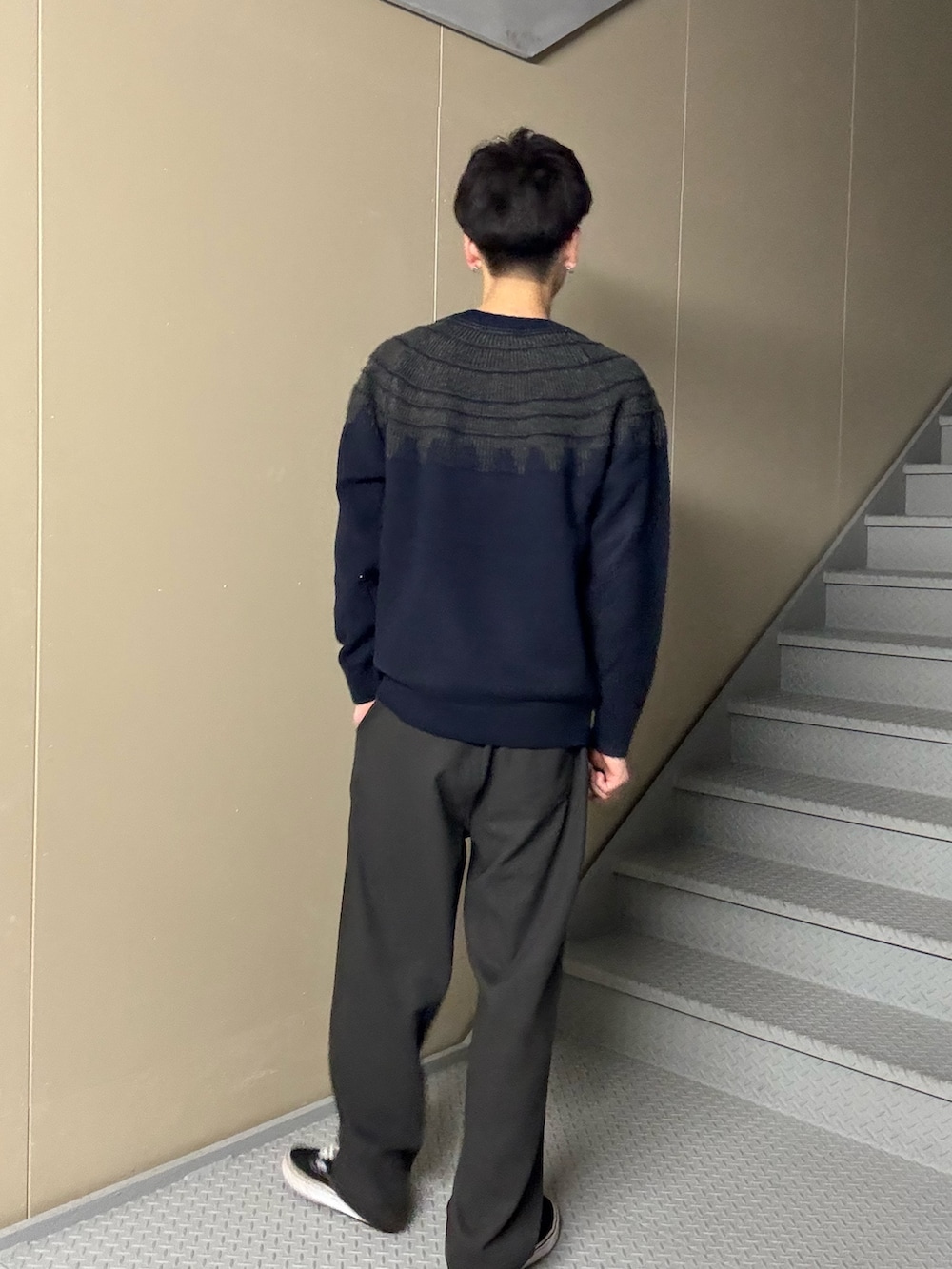 暗めのグレーのワイドパンツと合わせることで、全体のトーンが自然にまとまり、落ち着いた雰囲気が出ています。