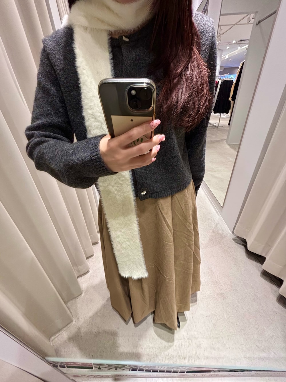 細めのマフラーはしっかりとした大きさと太さのマフラーよりアクセサリー感覚として使え、かつコーディネートにプラスワンしやすいマフラーになっています!🧣🤍