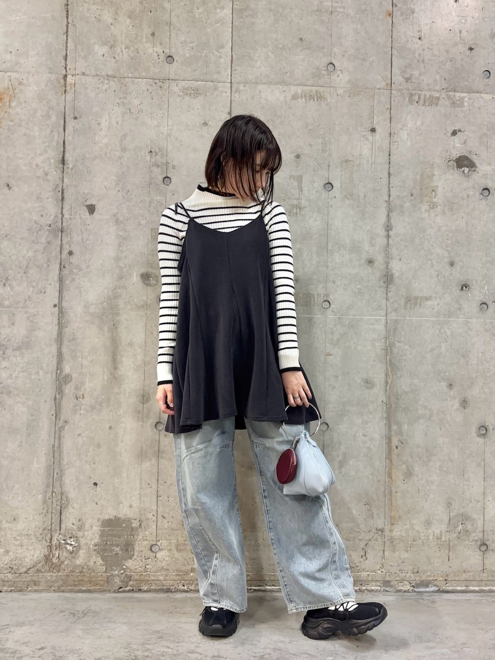 チャコールのミニワンピにデニムパンツを合わせ、カジュアルすぎず甘すぎず🙆♀️