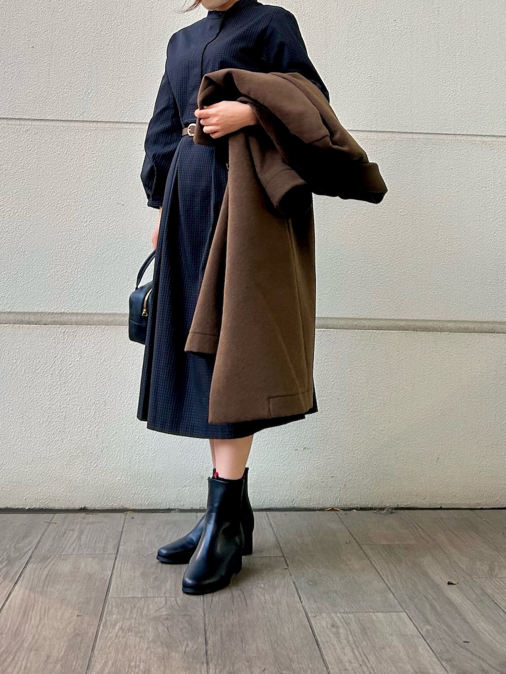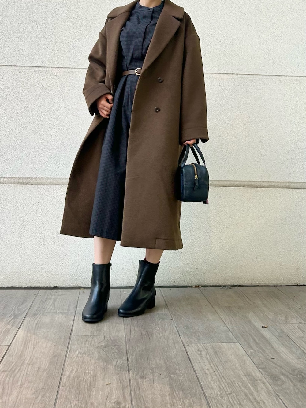 ブラウンのコートを主役に、ブラックのブーツとミニバッグで上品に締めた冬コーデです🐈⬛
