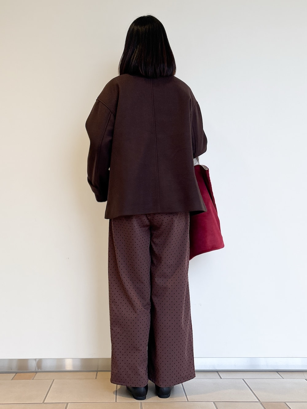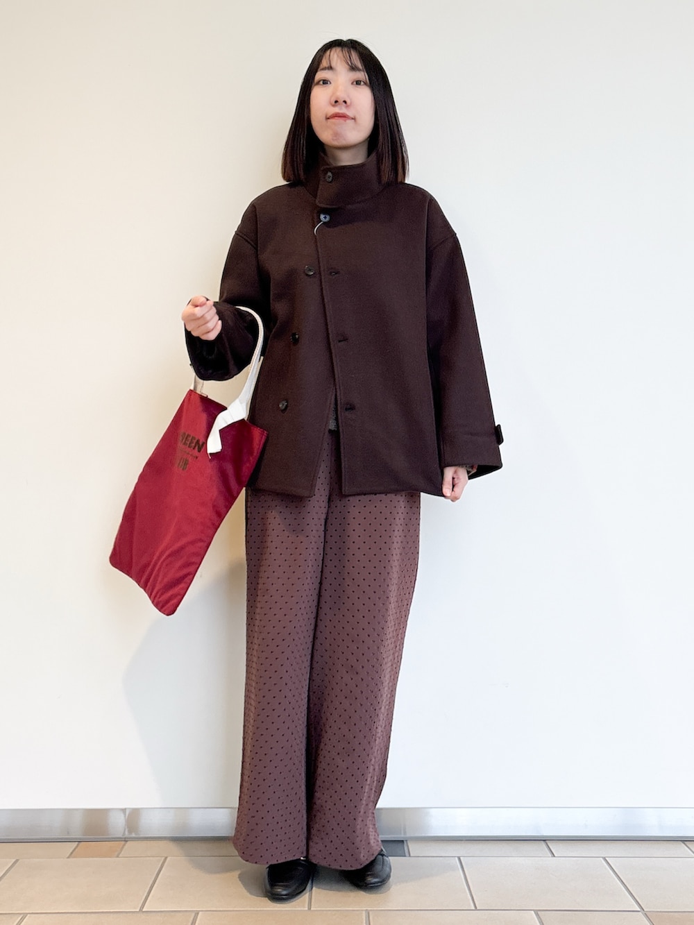 アウターはアップヘアでも安心なスタンドカラージャケットです!オーバーサイズで厚手のニットも楽々着れます。ポリエステル100%で軽いので移動が多い日に着たいなと思いました^^
