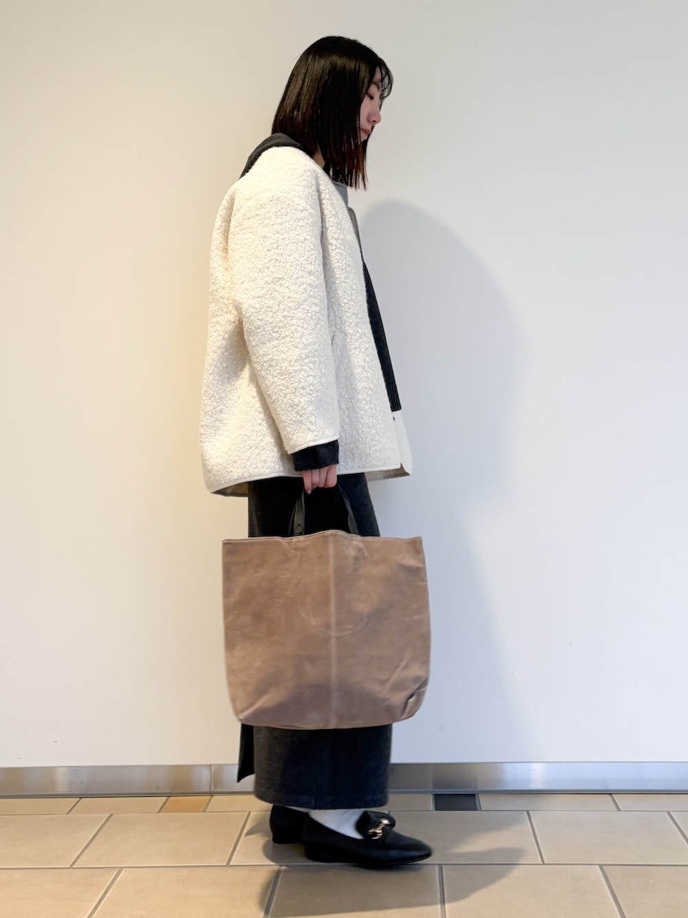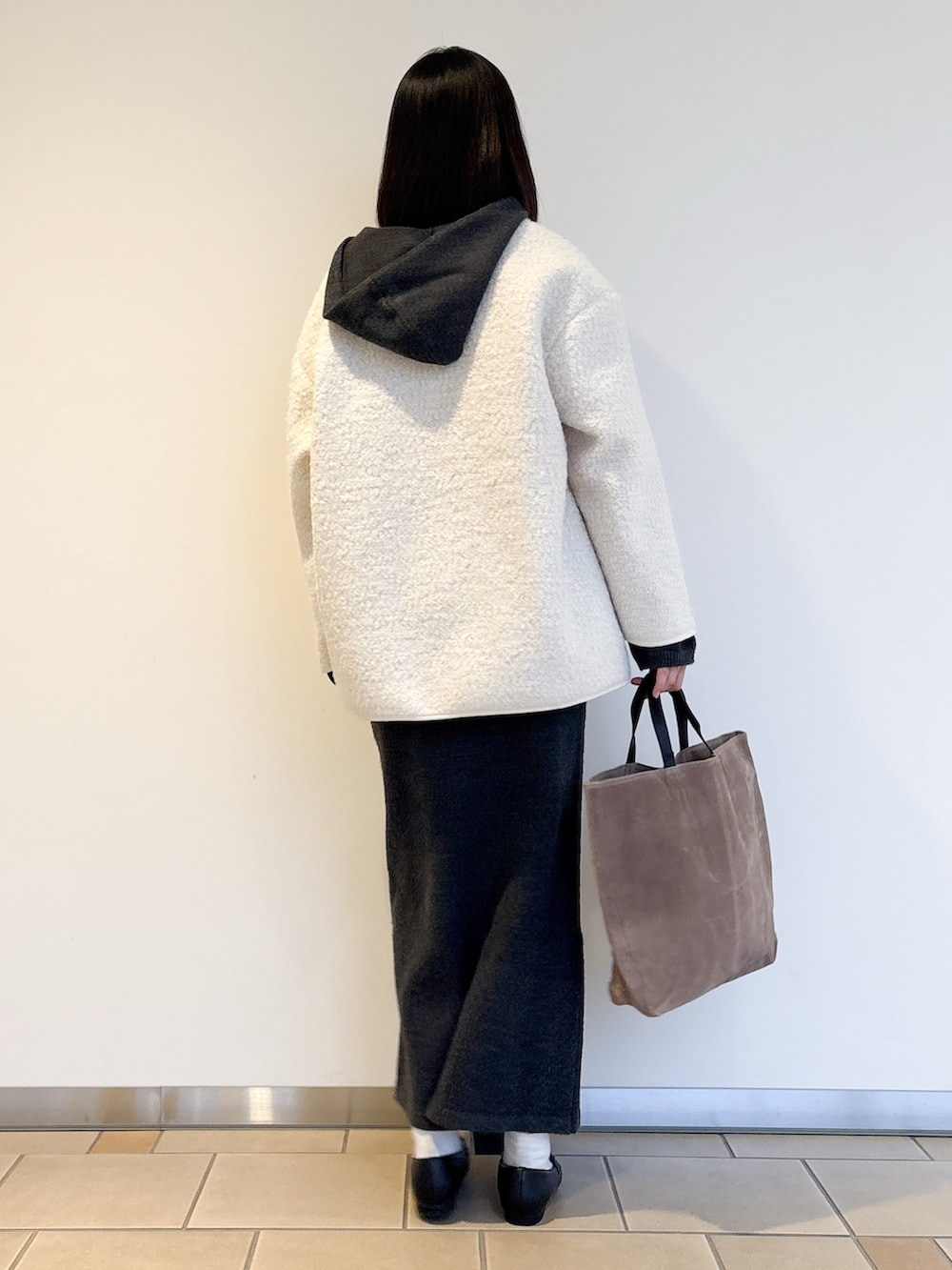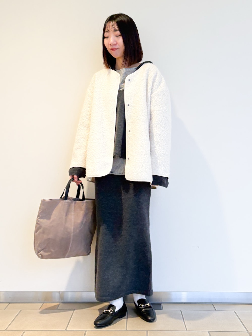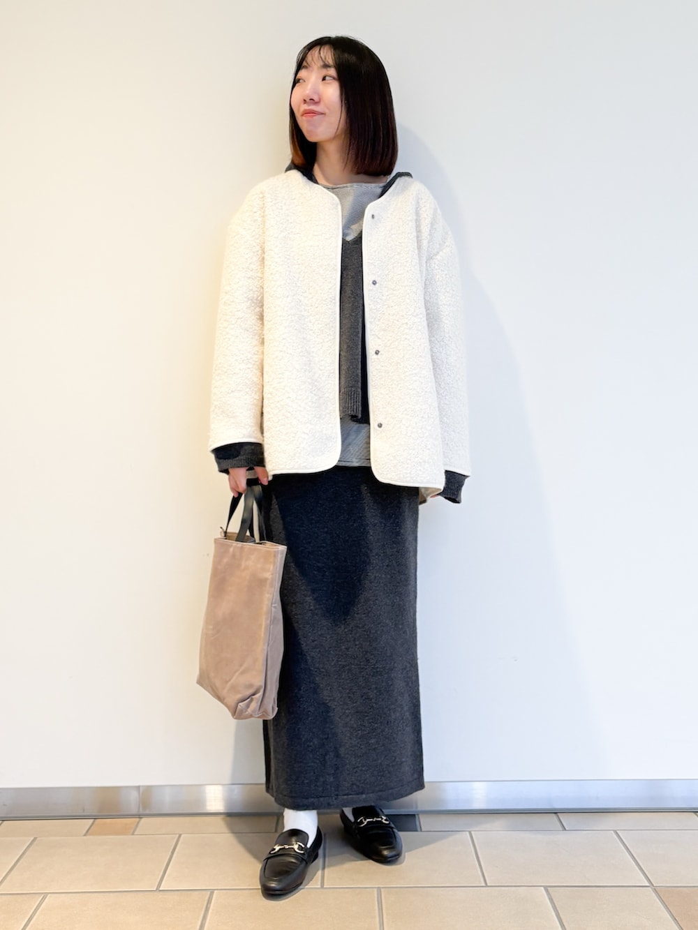 ニットはフード付きなのでノーカラージャケットと合わせました!ボアの毛足が短いのでスッキリ見えしますよ〜♩