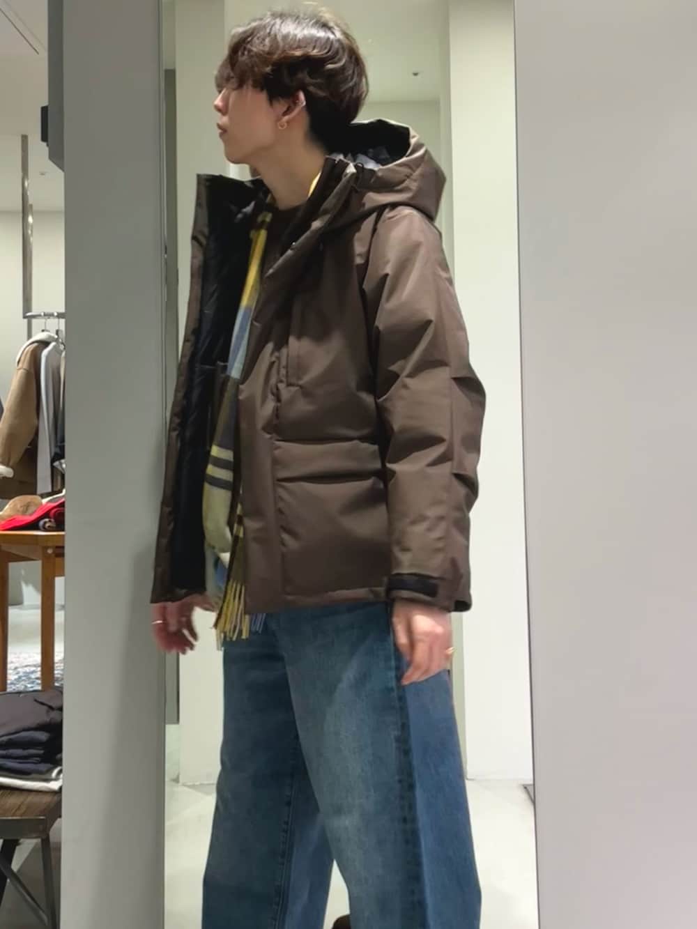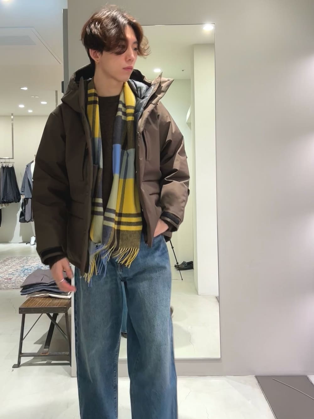 チェック柄マフラーとデニム合わせで、