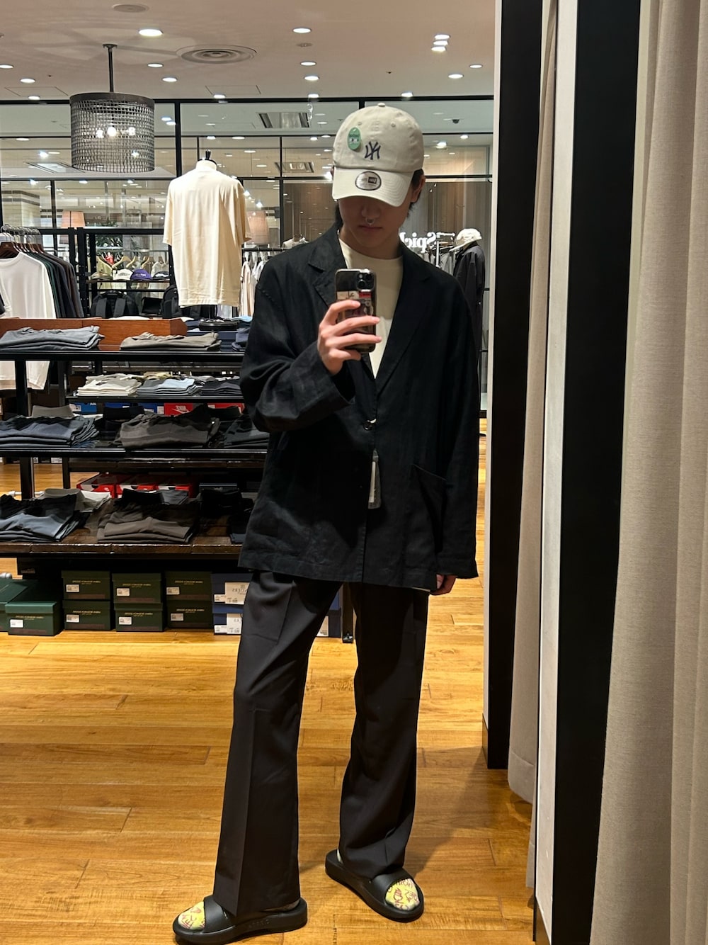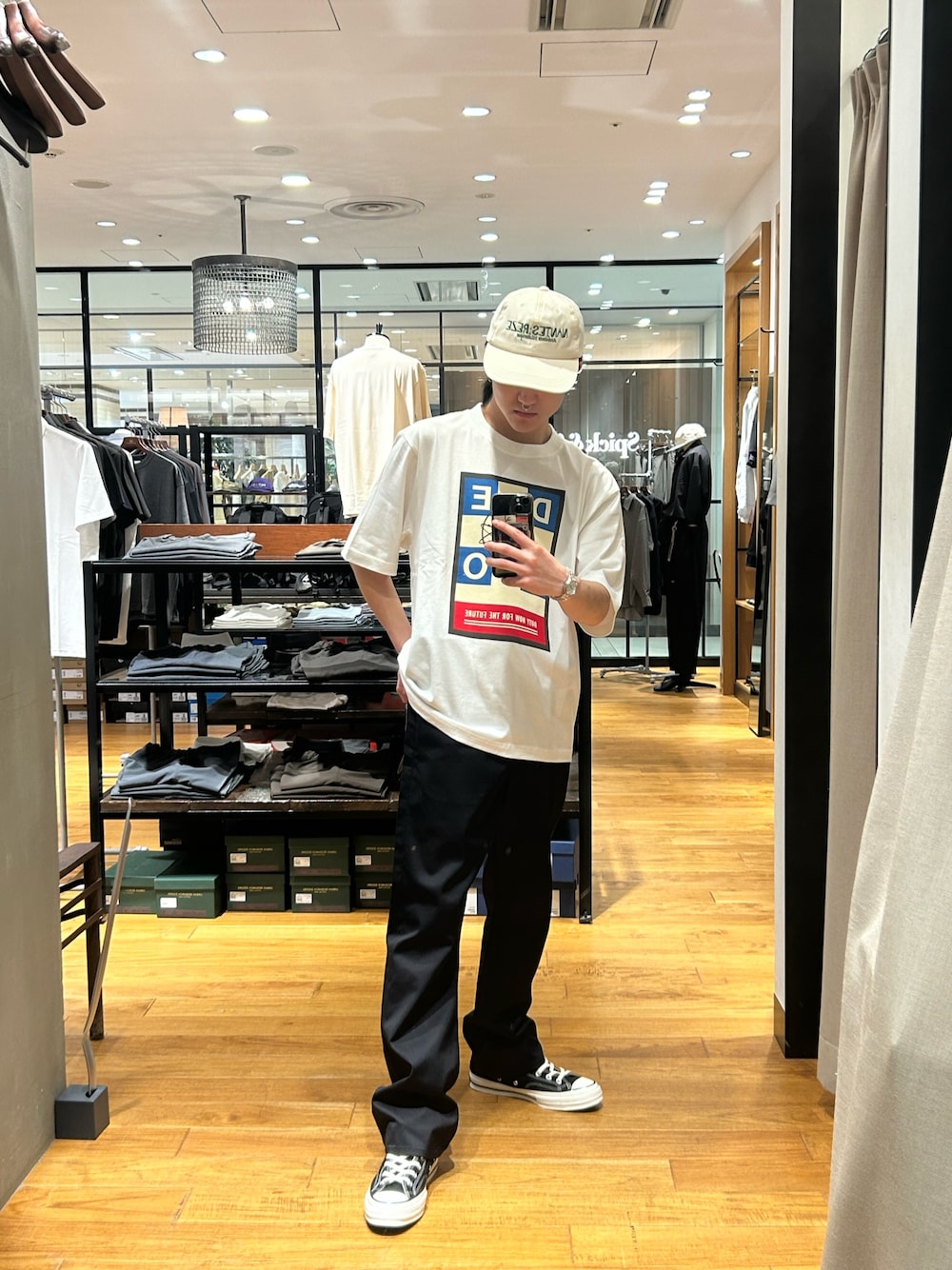 パンツもゆったりめ合わせで、足元はSALOMON。少し都会的なコーディネートにしています。