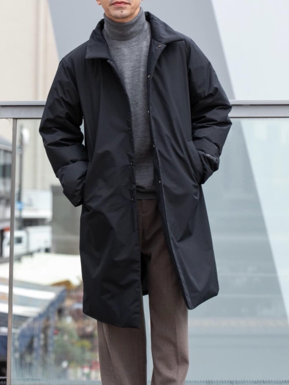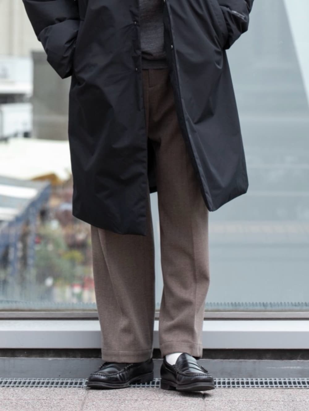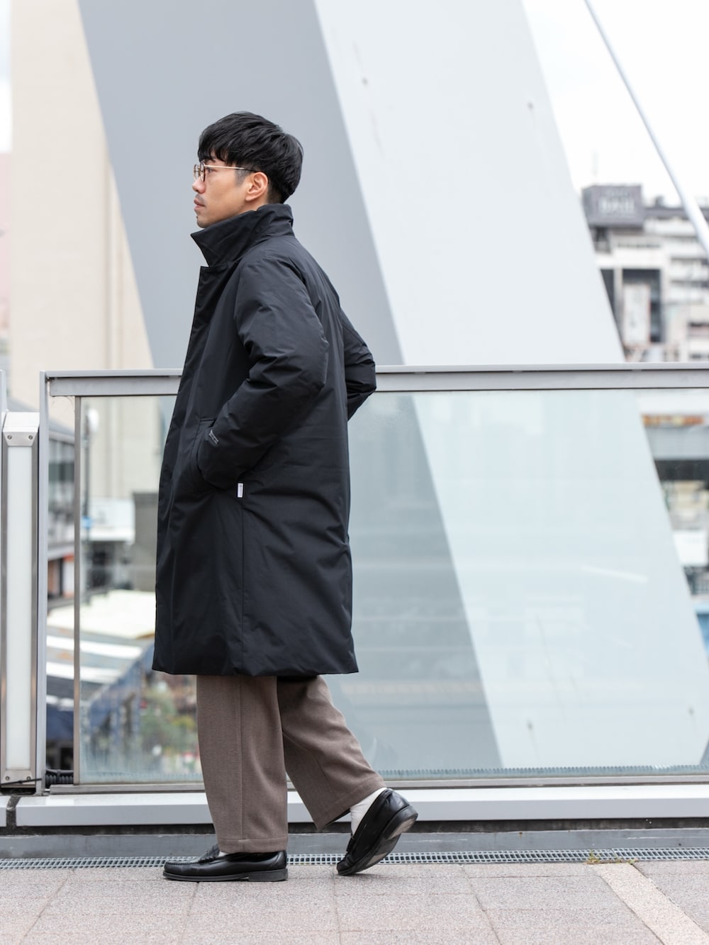 襟を立てても折ってもスッキリできれいな印象の別注+Phenixのダウンコートは真冬でもキレイなスタイルが叶います◎