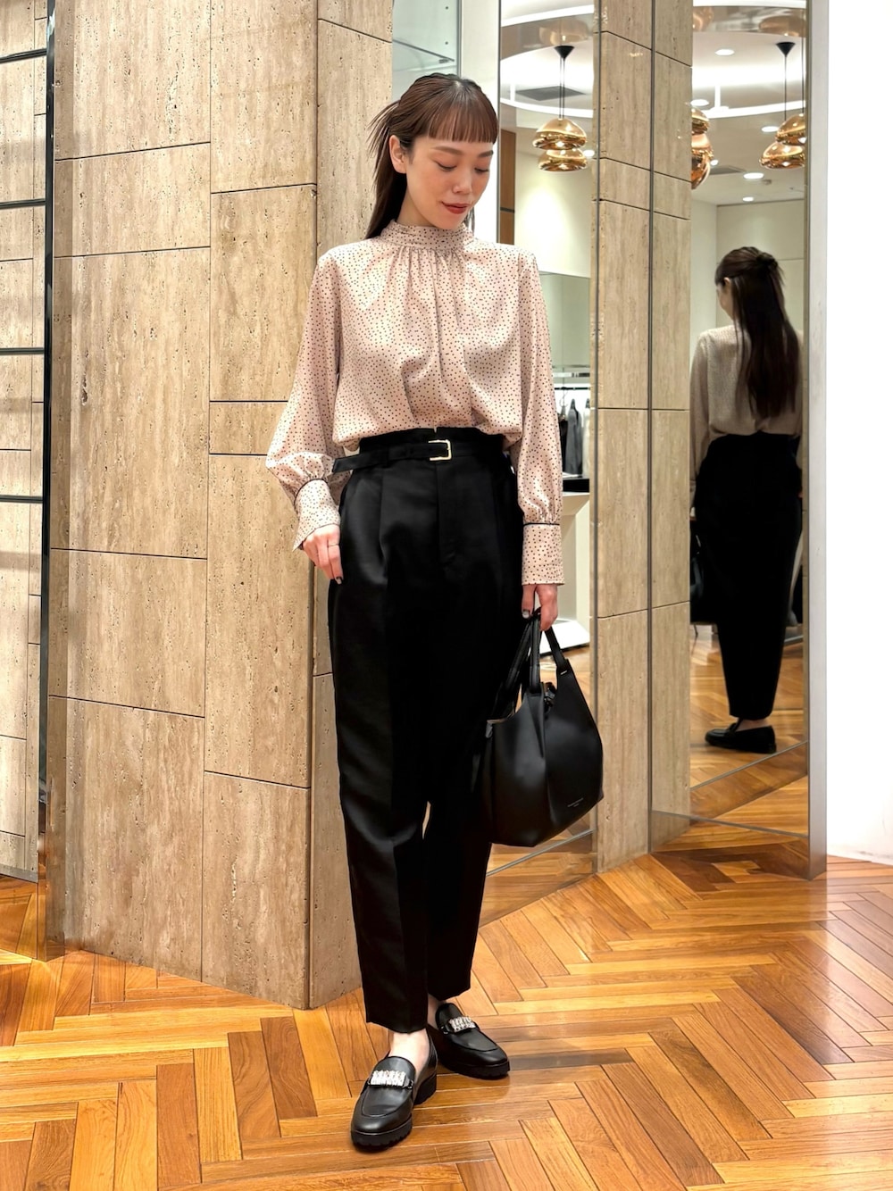 主役級なアウターをメインに、赤色を差し色に、サテンスカートでメリハリのあるコーディネートです♪