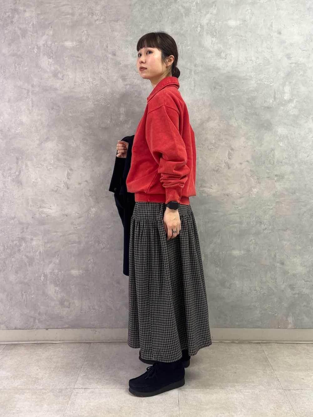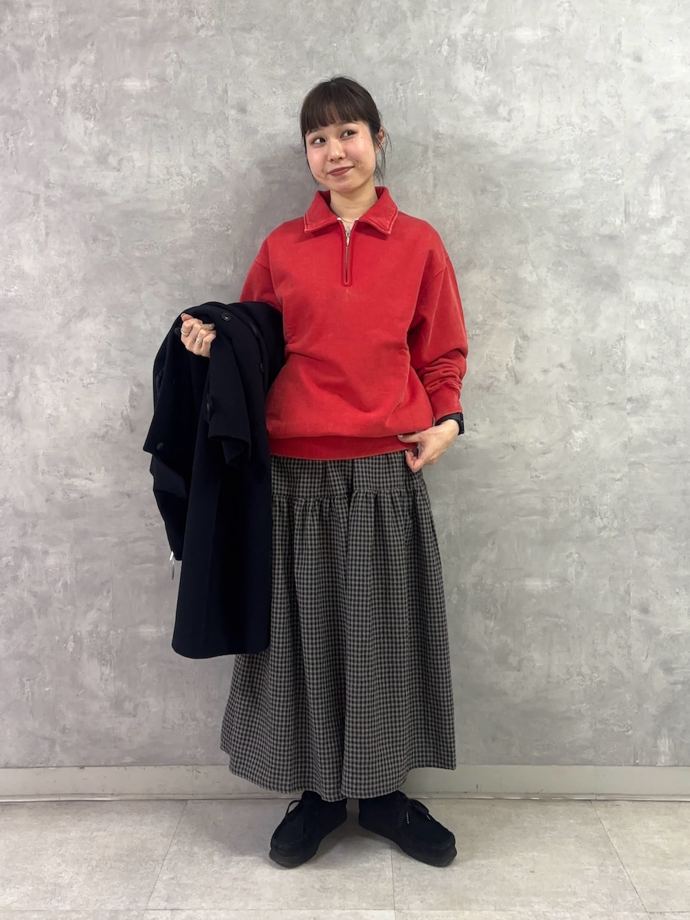 ハーフジップのエネルギッシュでスポーティーな感じと、スカートの可愛くも上品さのあるイメージが上手くバランスを取り合っています◎