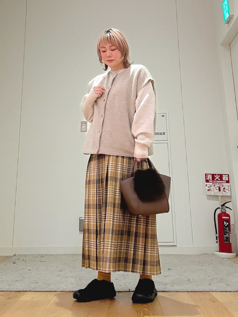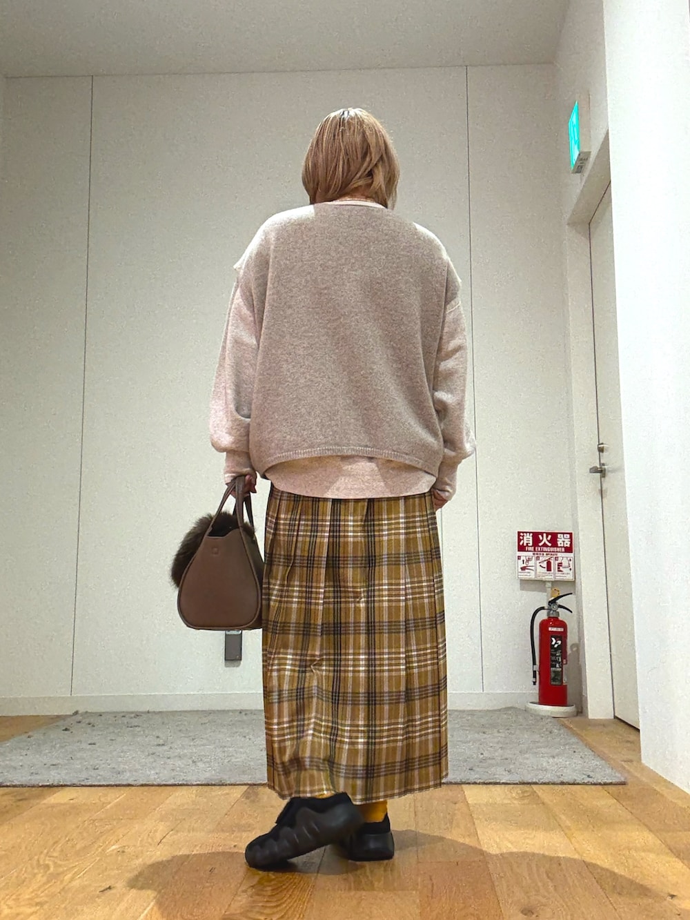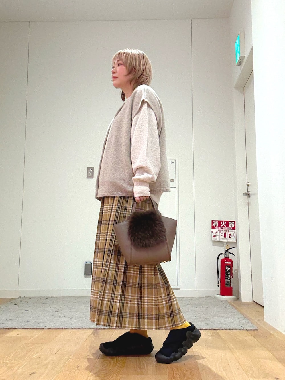 かぐれのとっても柔らかくて着心地のよいスウェットのコーデです!おすすめのリアルバイアイテムです。コーデがカジュアルになりすぎないようニットベストをレイヤードしました。こちらも軽くて柔らかくておすすめです!ポイントになるイエローのチェックスカートとリバーシブルでつかえるアーバンリサーチのアウターを合わせました。年齢問わず挑戦しやすいカジュアルコーデです!