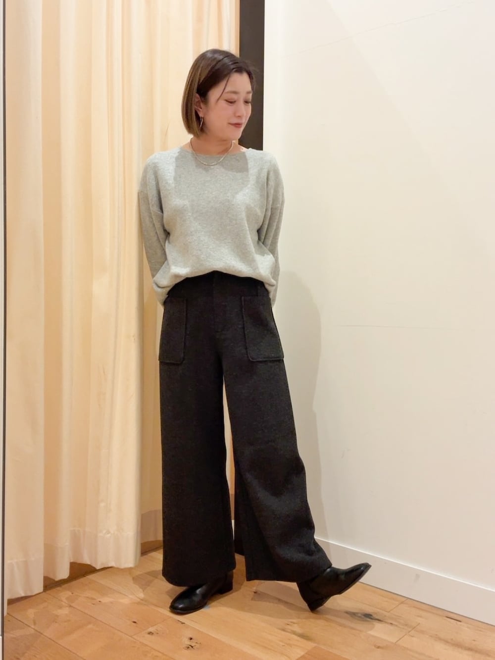 差し色はニットのグレーとアクセサリーのシルバーです◎