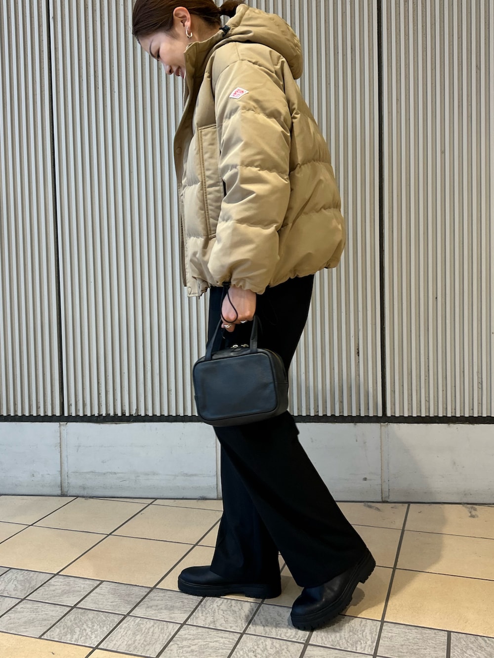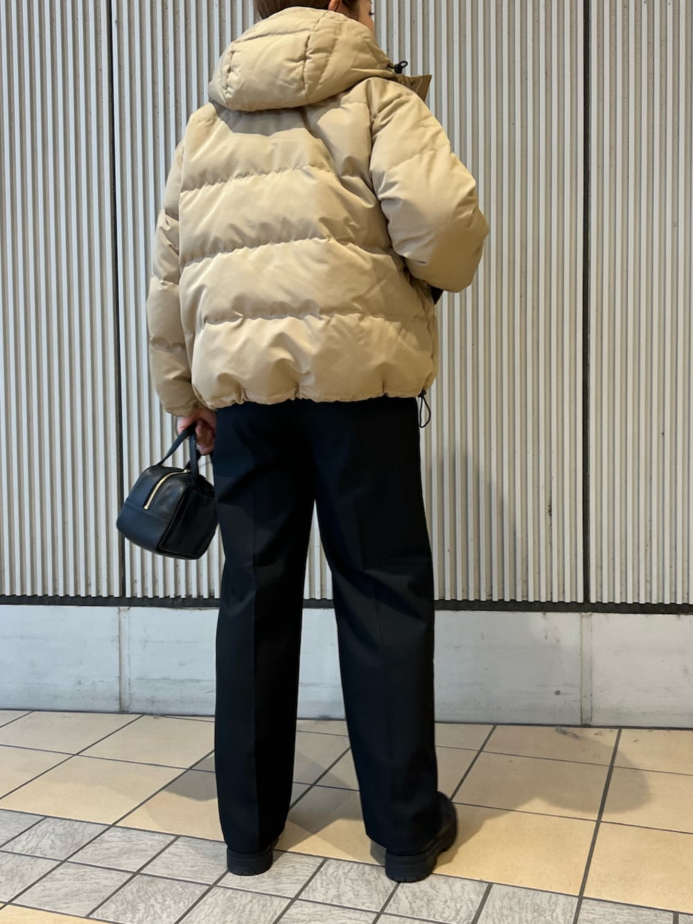 DANTONの新色ベージュのダウンジャケットと、スラックスは嬉しい裏起毛生地なので急遽公園に行くことになっても暖かく過ごして頂けるスタイリングにしました🛝