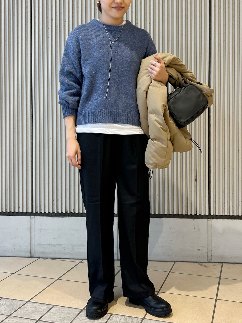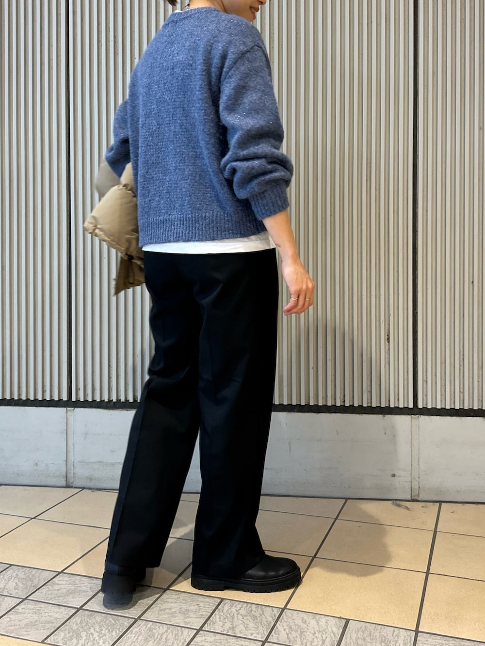 動きやすいパンツスタイルですが、ラメ糸のニットとスラックスでキレイめカジュアルにまとめました🫐