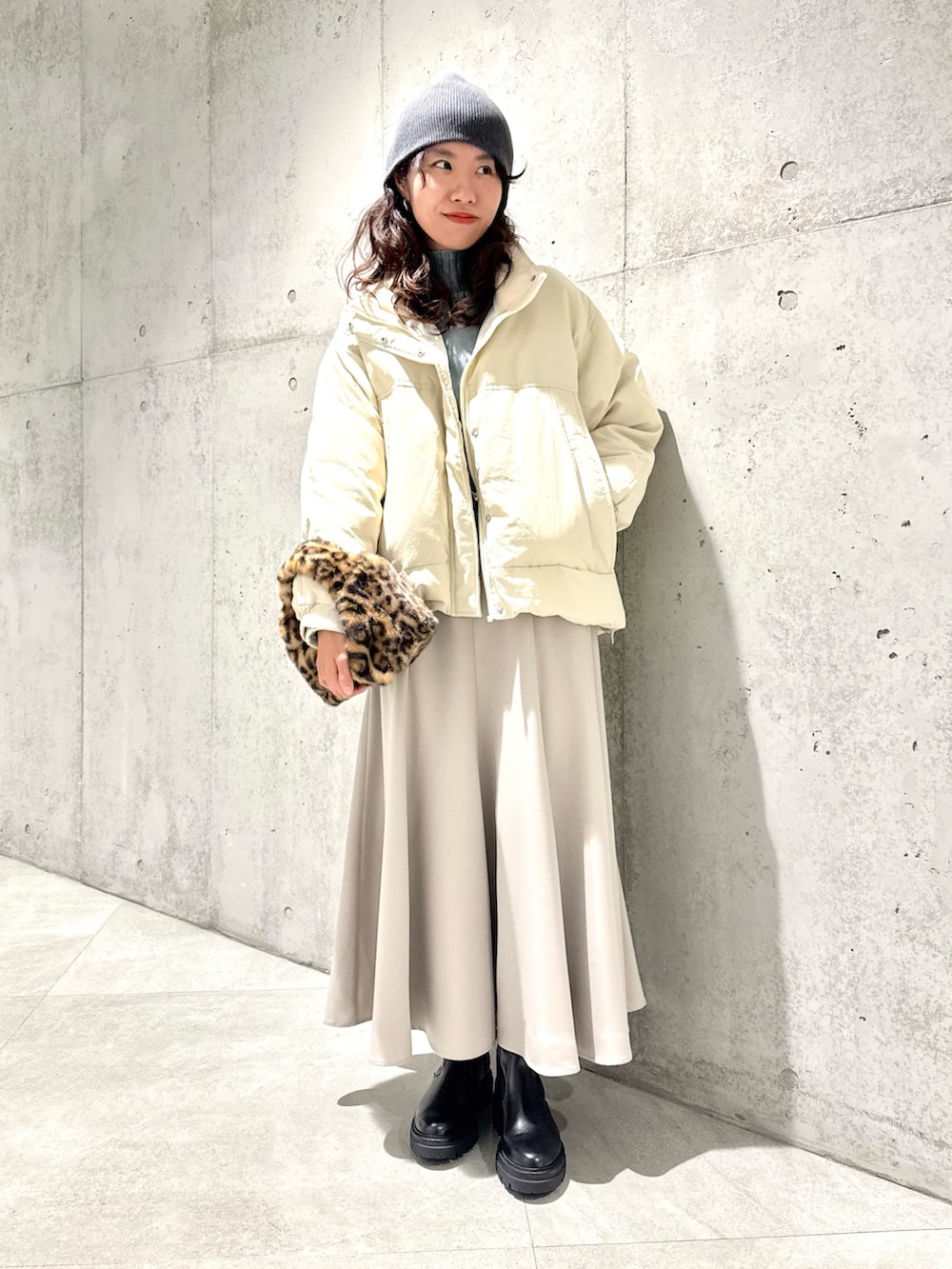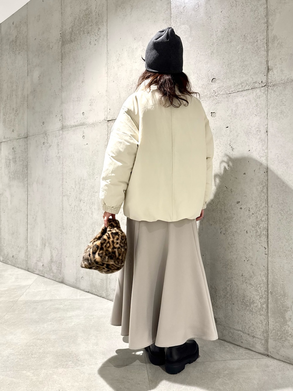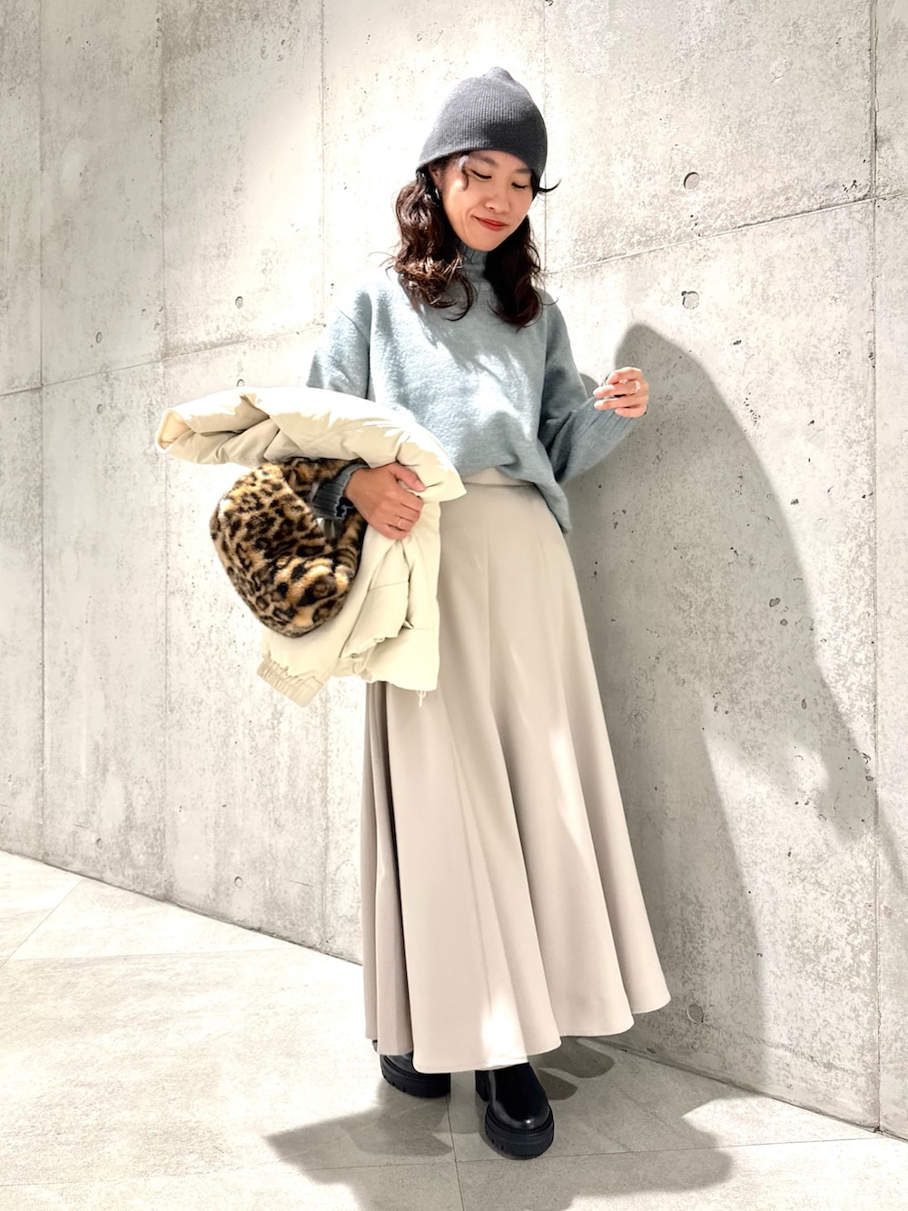 ニットはミントカラーなので、ほっこりしすぎずに着られますよ。