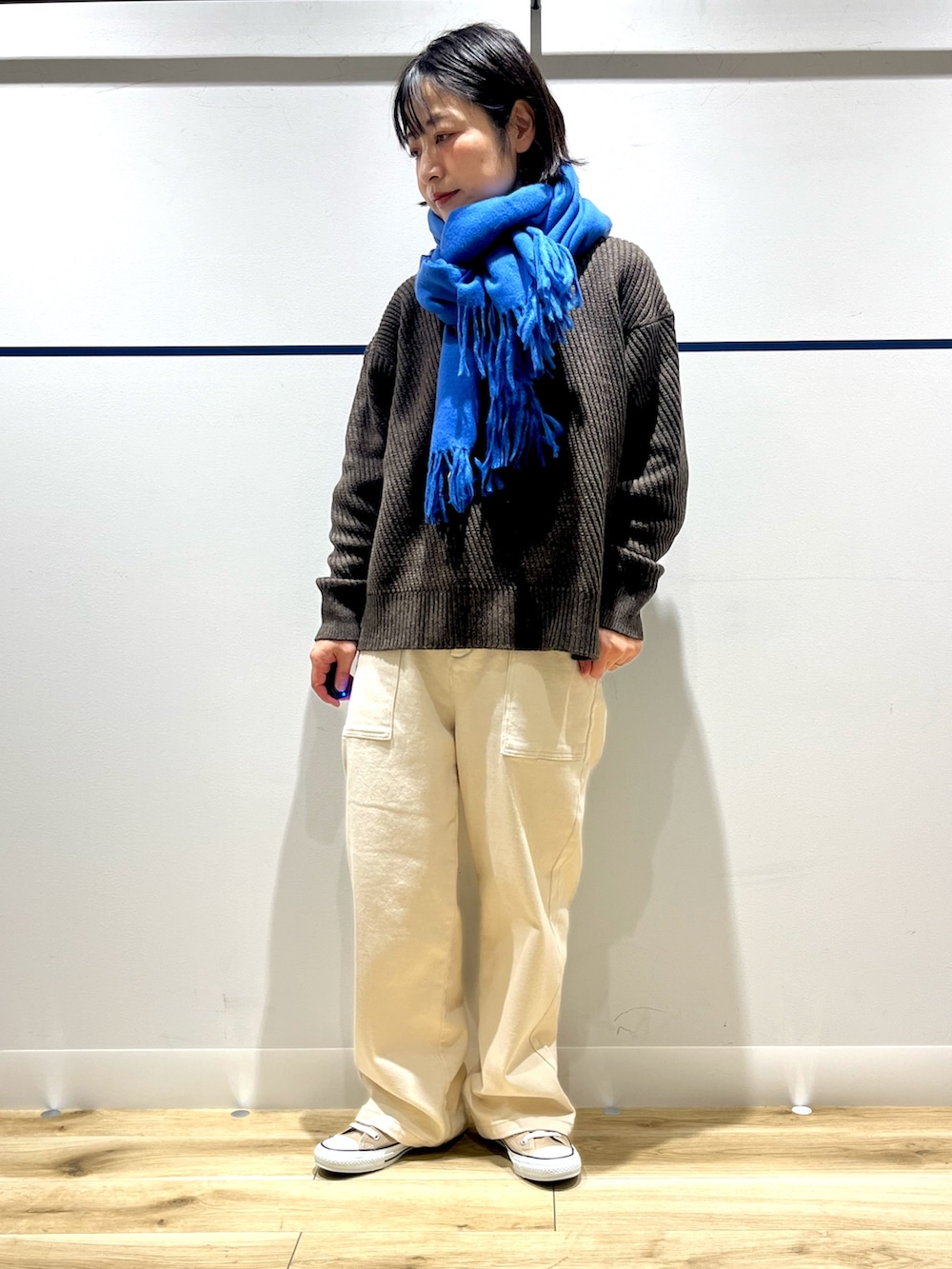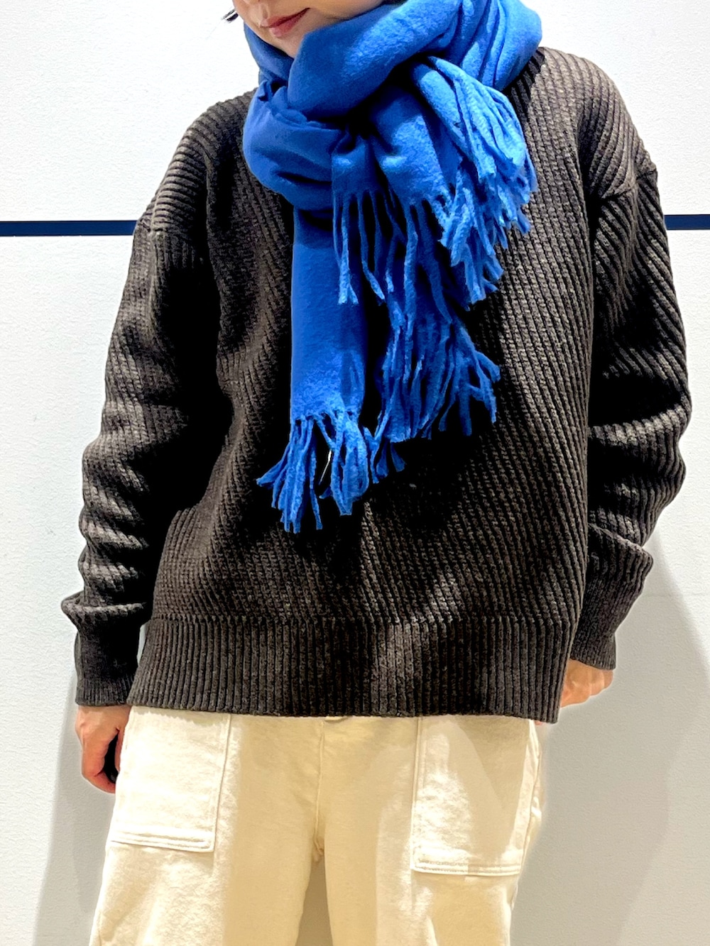 あえてのビビットカラーのマフラーを
