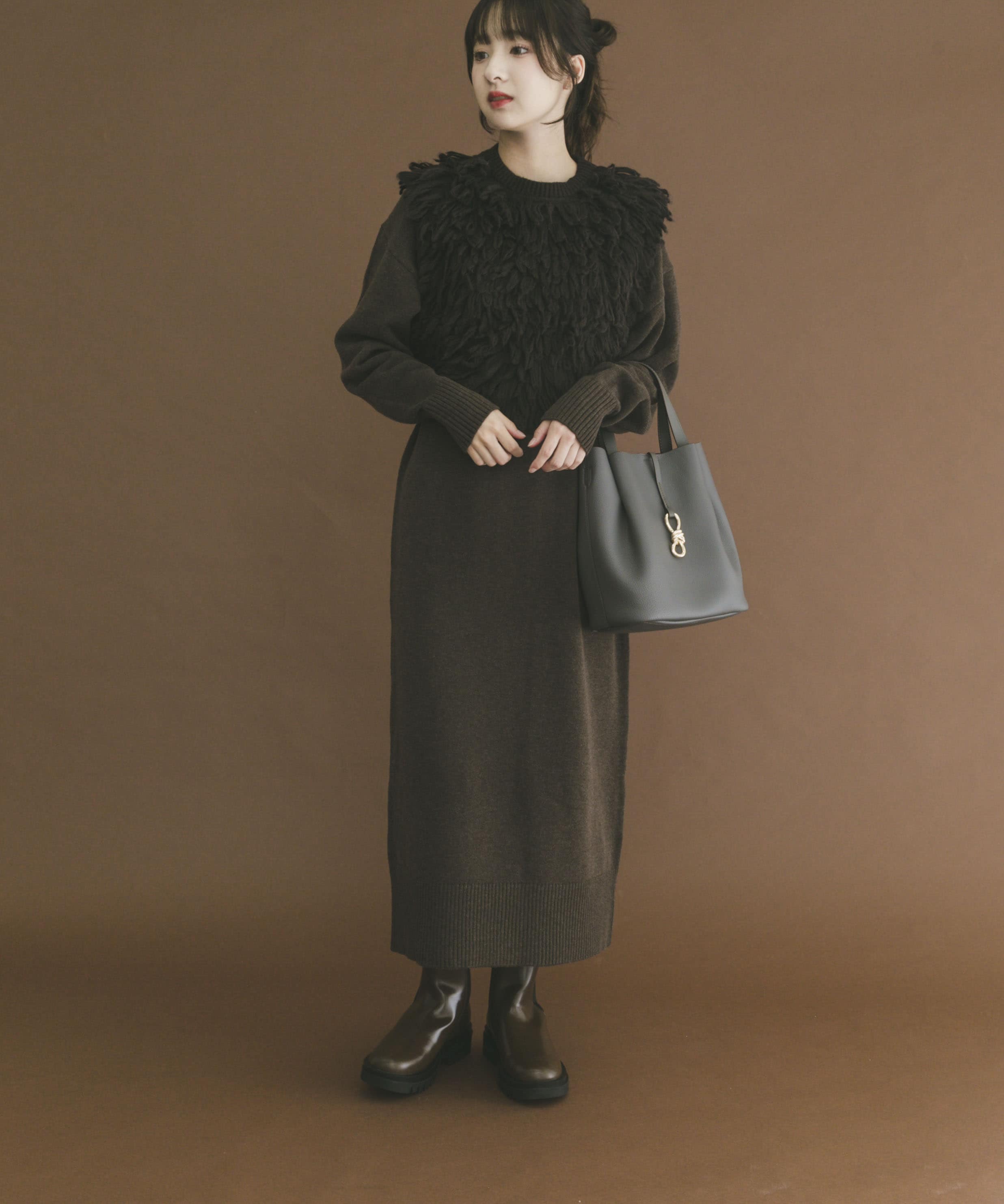 ブラウンのニットワンピースはデザインが凝っていて華やかなのでお出かけ腰回りにもオススメです☺︎
