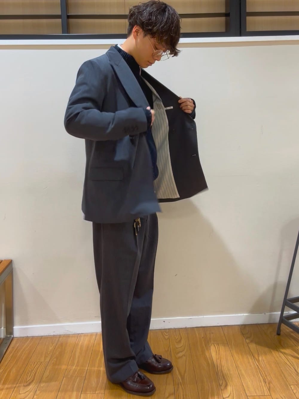 カジュアルなスーツセットアップにハーフジップのニットを合わせ、キレイめだけどキレイすぎない、程よくキレイ、そんなコーデを組んでみました!!
