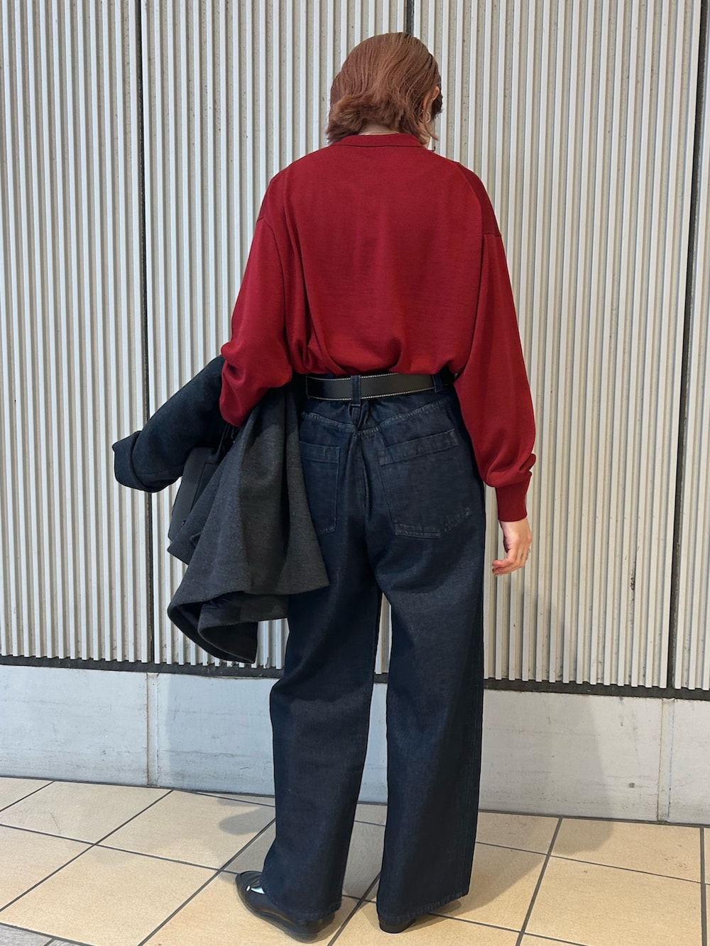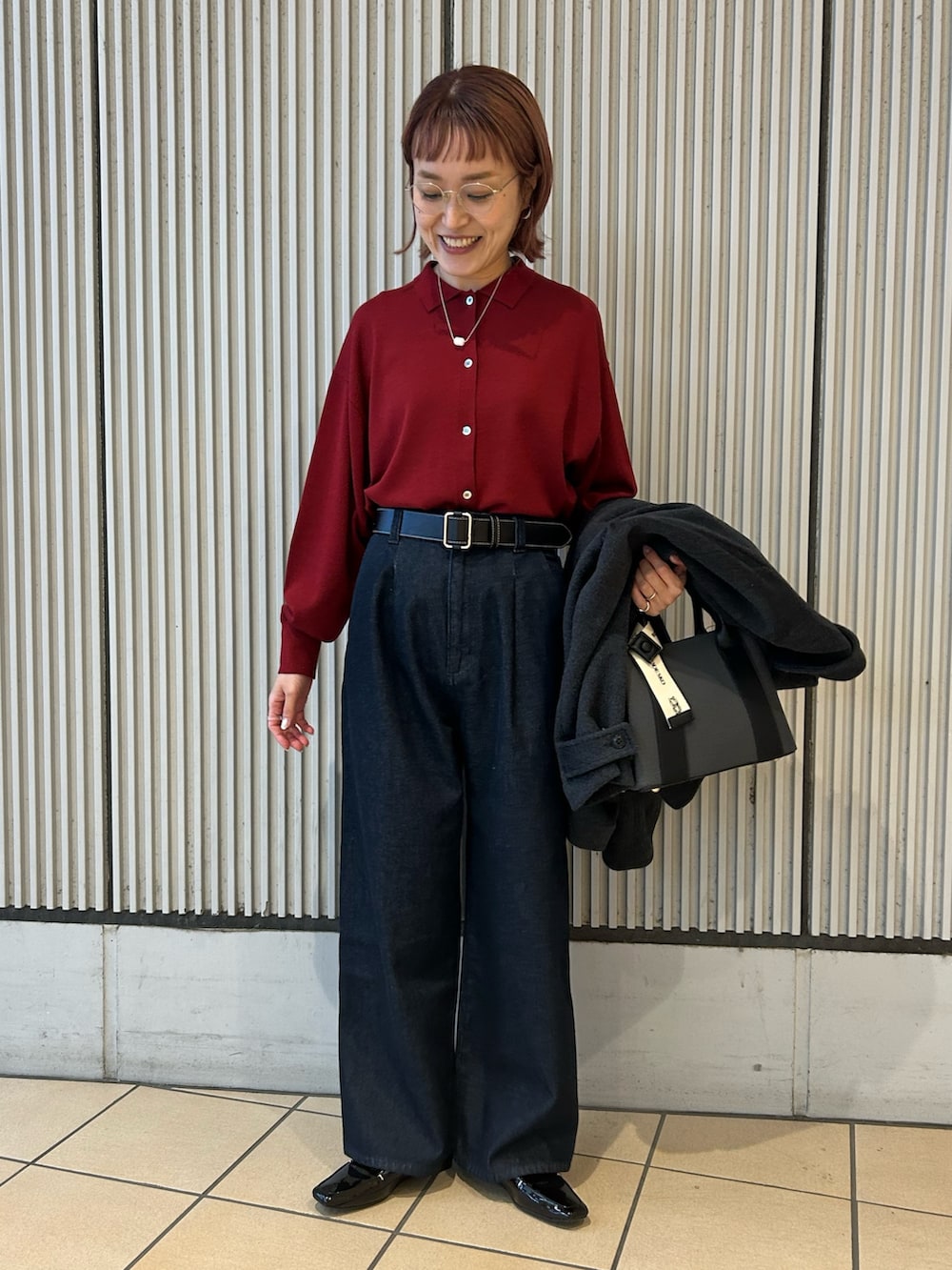 インナーに着たかぐれのニットシャツを差し色にカジュアルコーデです。
