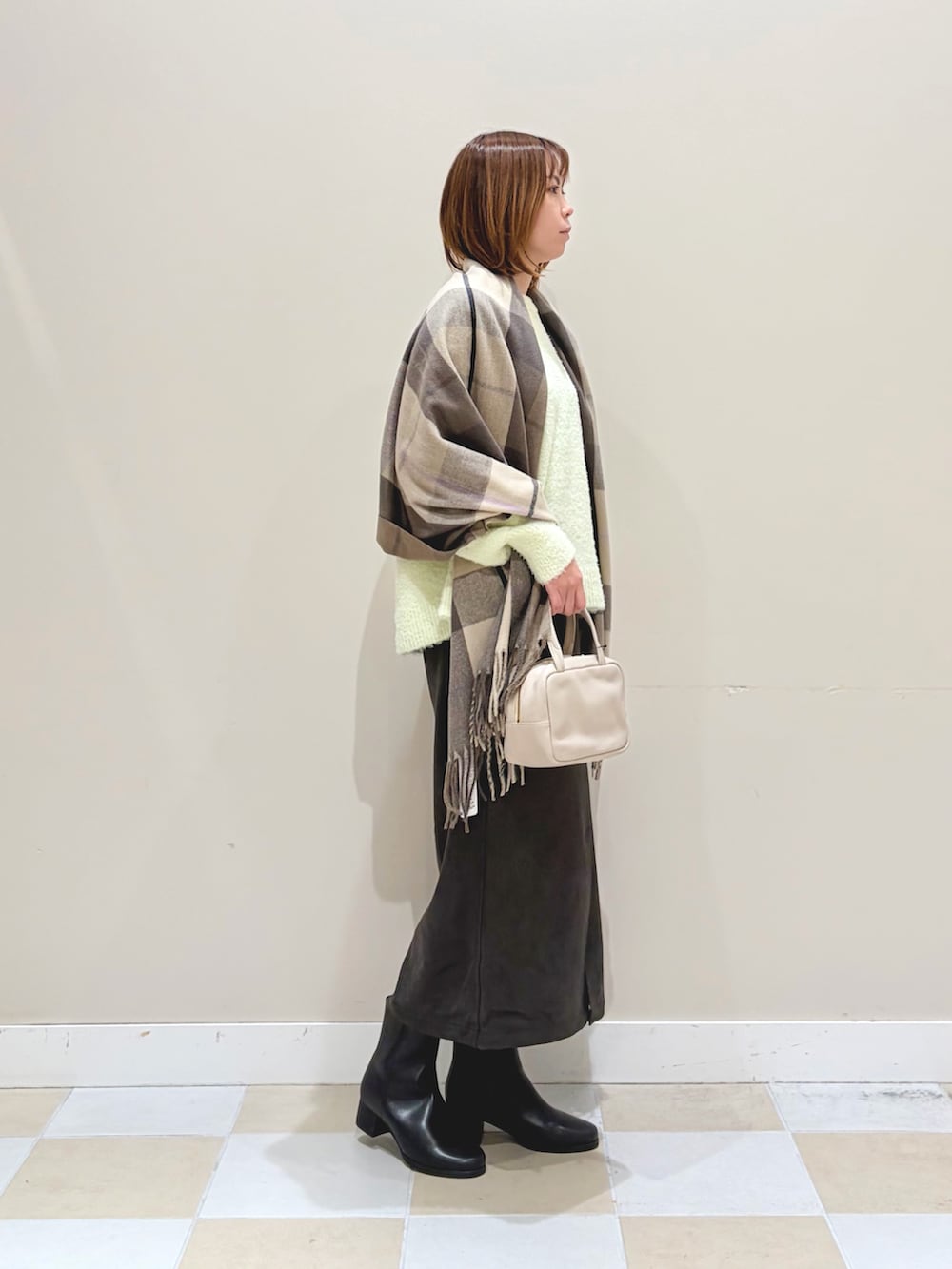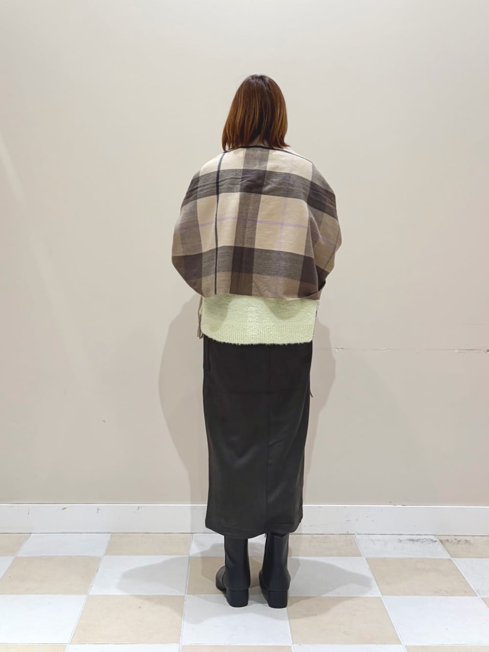 淡いカラーとふわっとした質感が可愛いニットにチェックストール、タイトスカートでコーディネートしました!