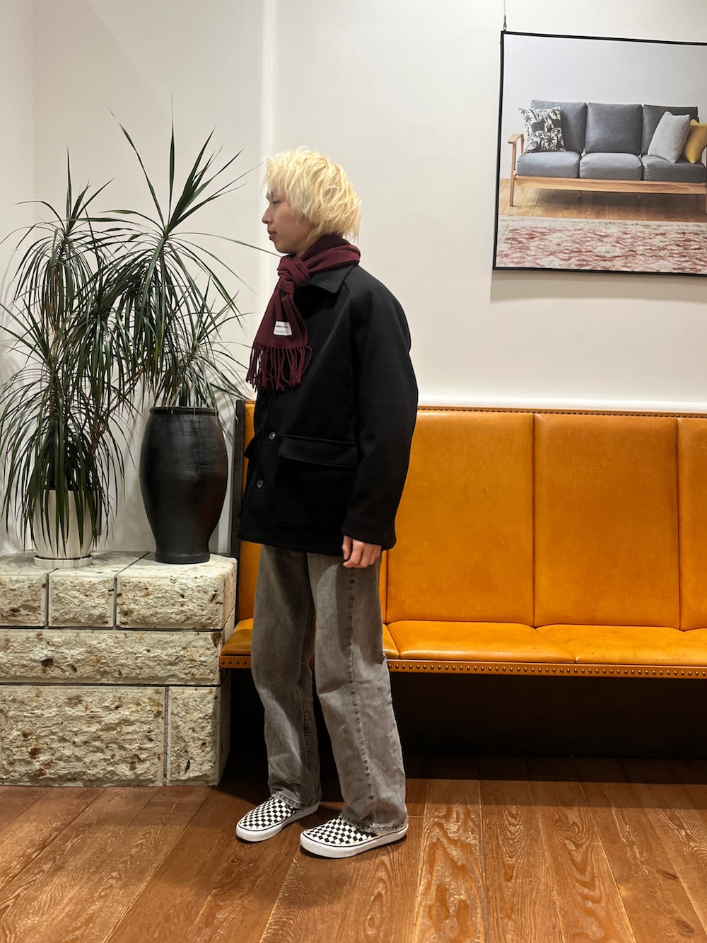 シンプルなショートニットに赤いマフラーで可愛らしくしてます!