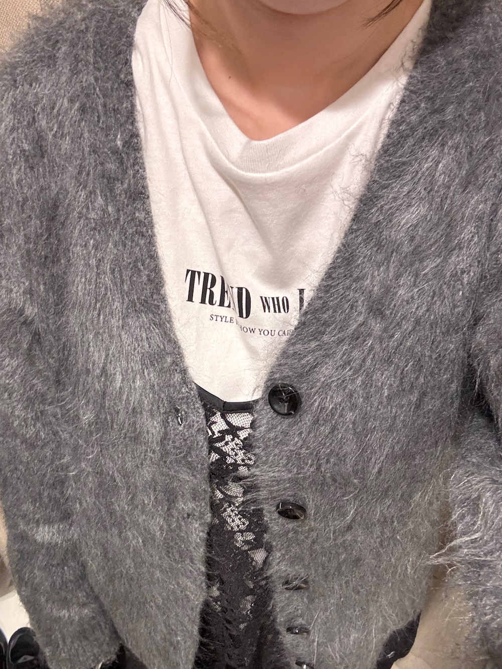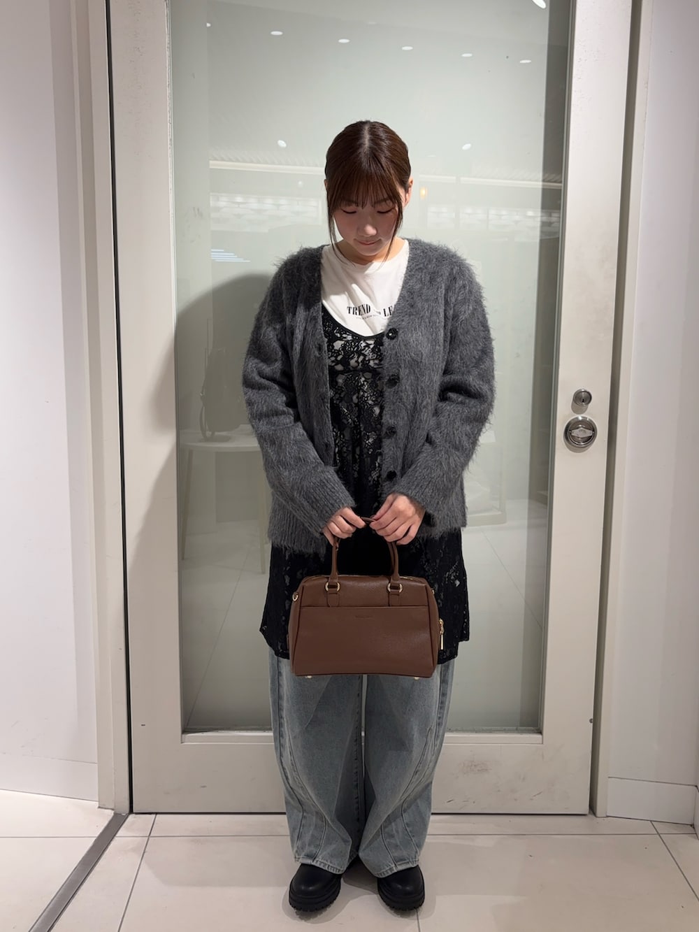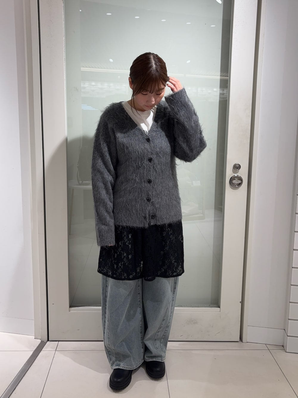 ふわふわのシャギーカーディガンにレースのワンピースをレイヤードし大人カジュアルコーデに🤍