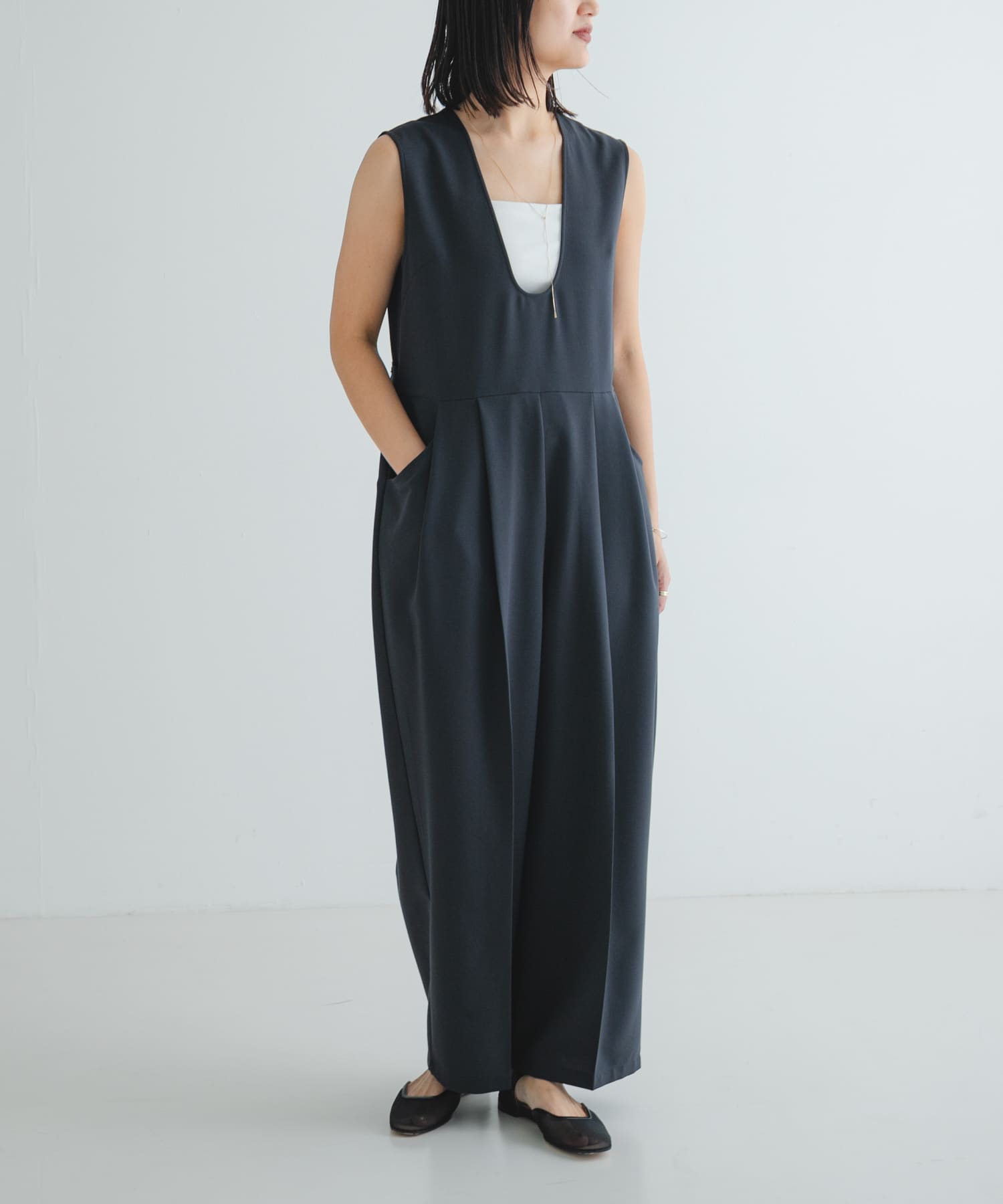 Uネックタックオールインワン