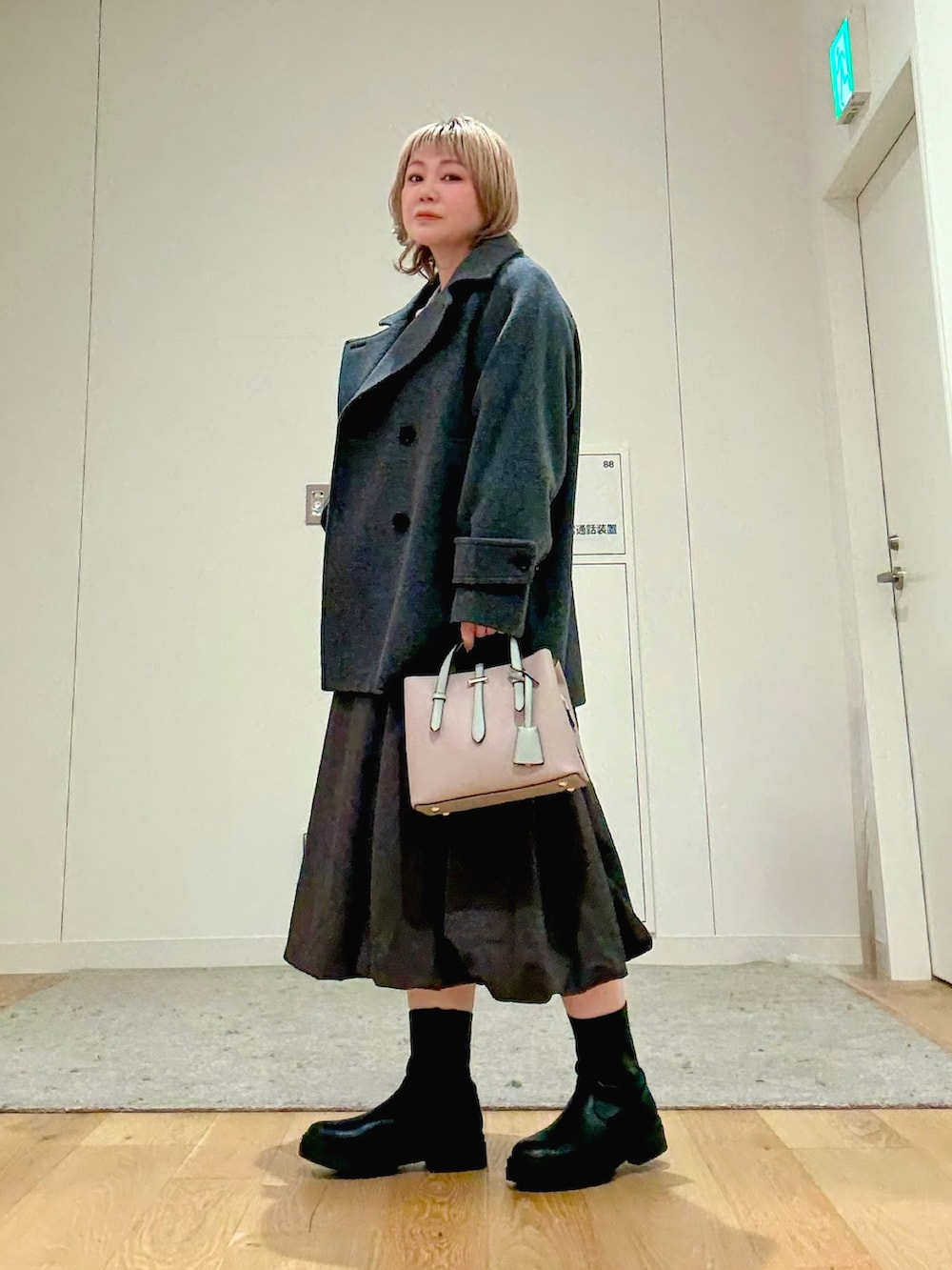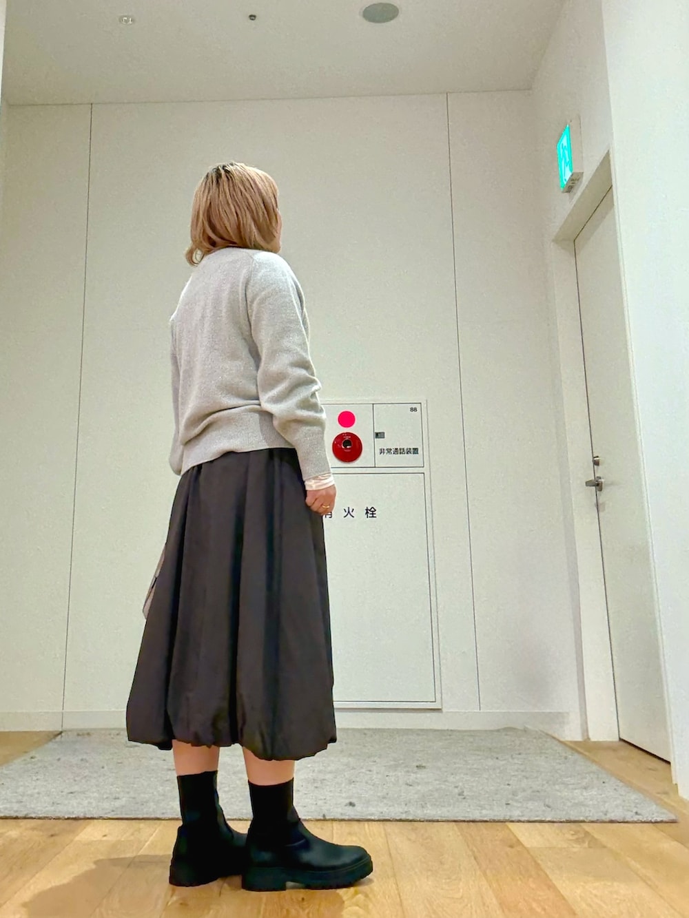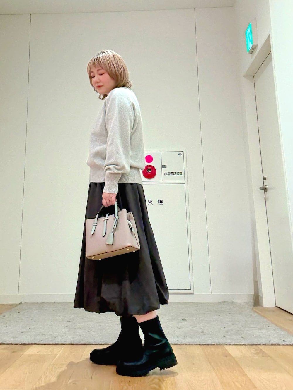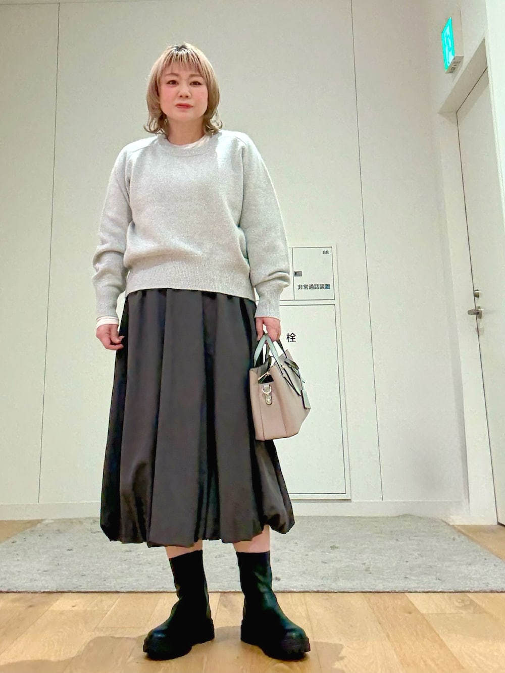 派手すぎず、ほどよいラメがキレイなミントカラーのニットにグレー系のアイテムを合わせました。クリスマスやお正月着るのもおすすめですし、普段使いもしやすい着回し力抜群のニットです。バルーンスカートは裾の丸みが可愛いです!こちらのバルーンスカートはシルエットが広がりすぎないので甘すぎず、キレイに履けます。可愛いかんじは苦手という方にも是非おすすめしたいです。