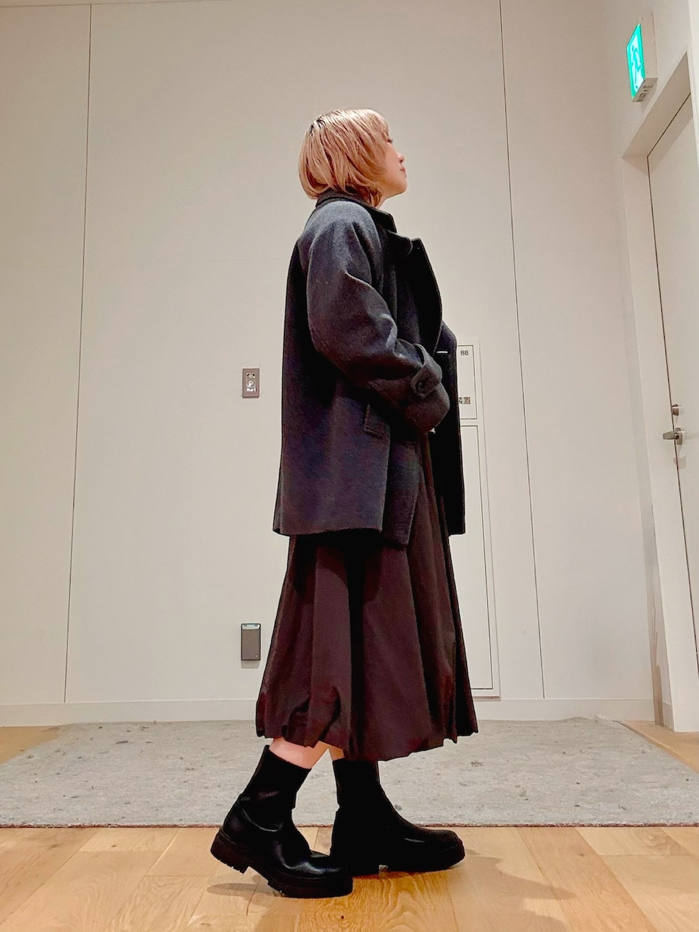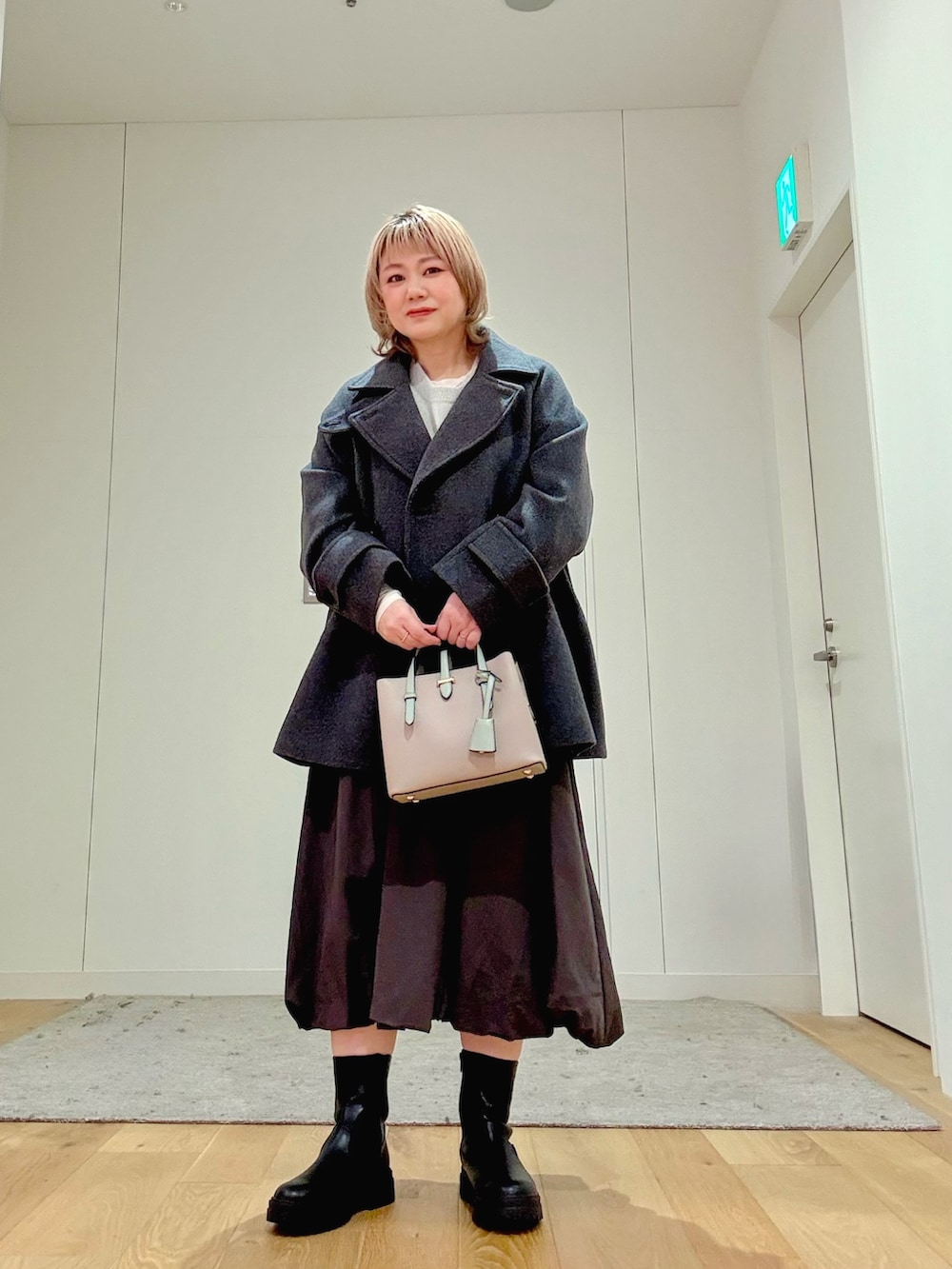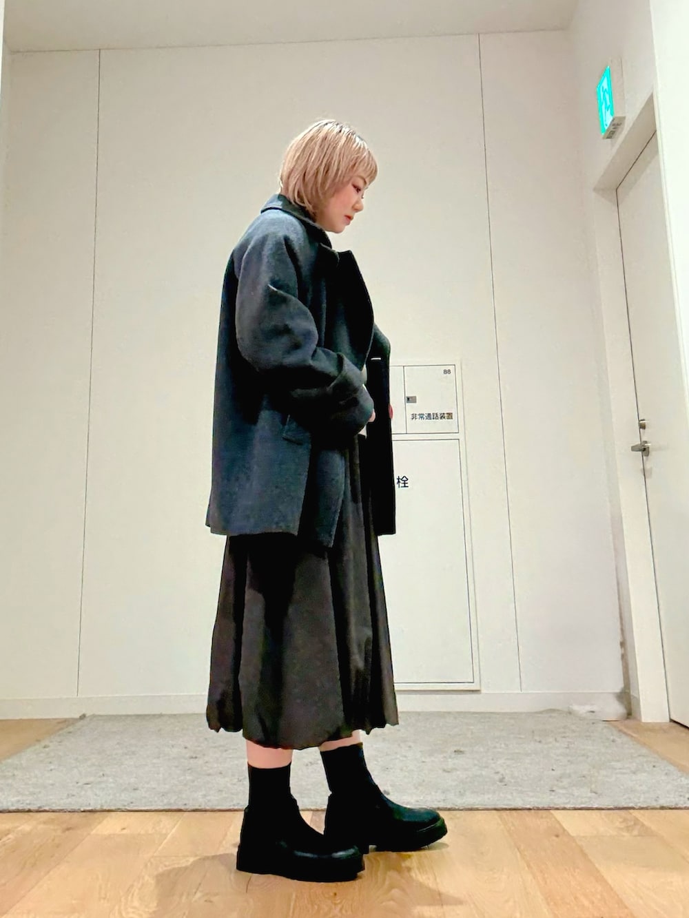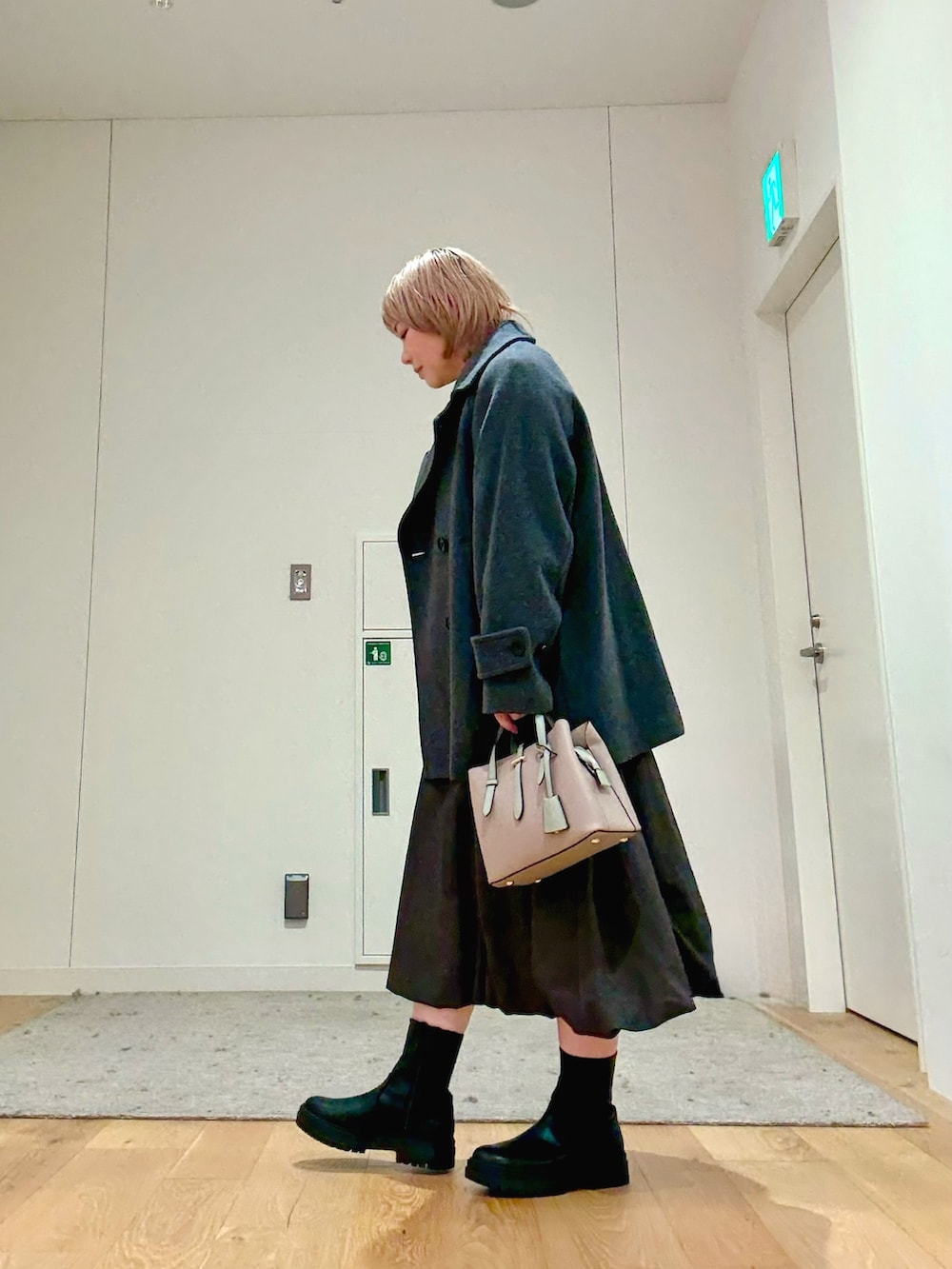派手すぎず、ほどよいラメがキレイなミントカラーのニットにグレー系のアイテムを合わせました。クリスマスやお正月着るのもおすすめですし、普段使いもしやすい着回し力抜群のニットです。バルーンスカートは裾の丸みが可愛いです!こちらのバルーンスカートはシルエットが広がりすぎないので甘すぎず、キレイに履けます。可愛いかんじは苦手という方にも是非おすすめしたいです。