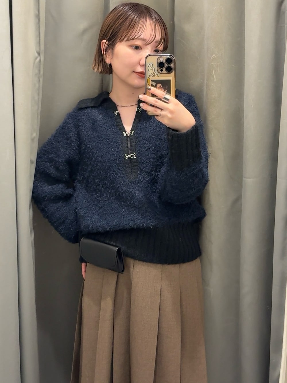 柄スカーフのデザインがアウターからチラッと覗き、レイヤードにほどよい華やかさと立体感をプラス🫶