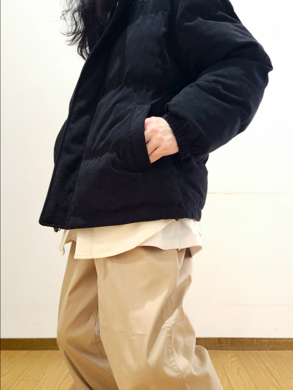 たっぷりの中綿入りのボリューム感のあるスタンドカラージャケット。コーデュロイの生地感が冬らしい一着。