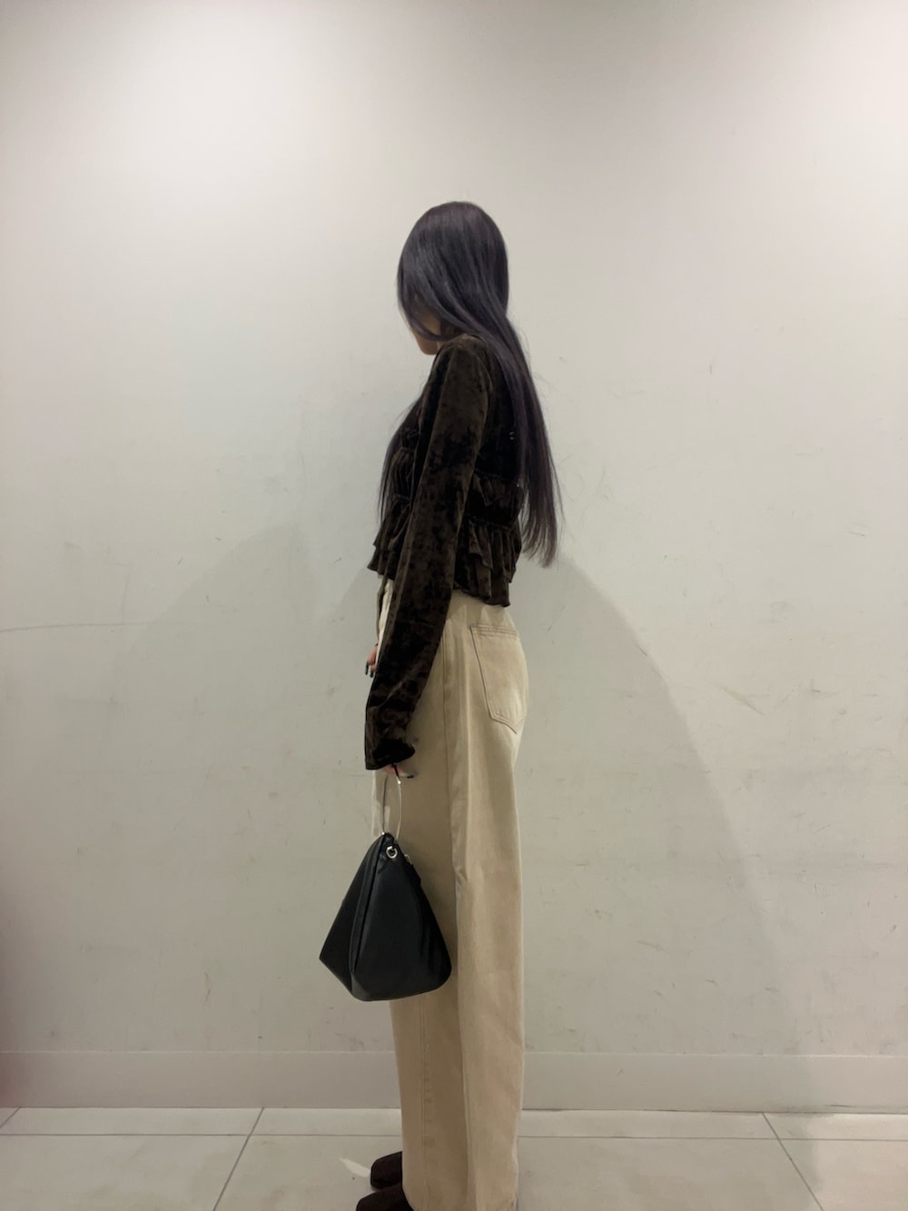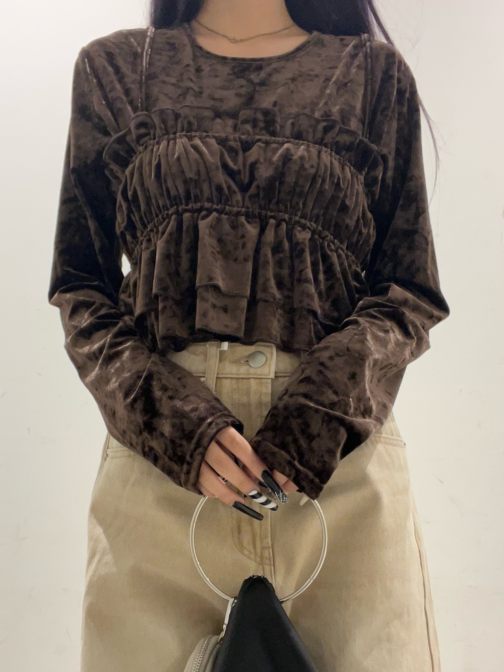 デニムとフリルのベロア生地でメリハリをつけて大人っぽさとかわいいさを同時に演出しました♡