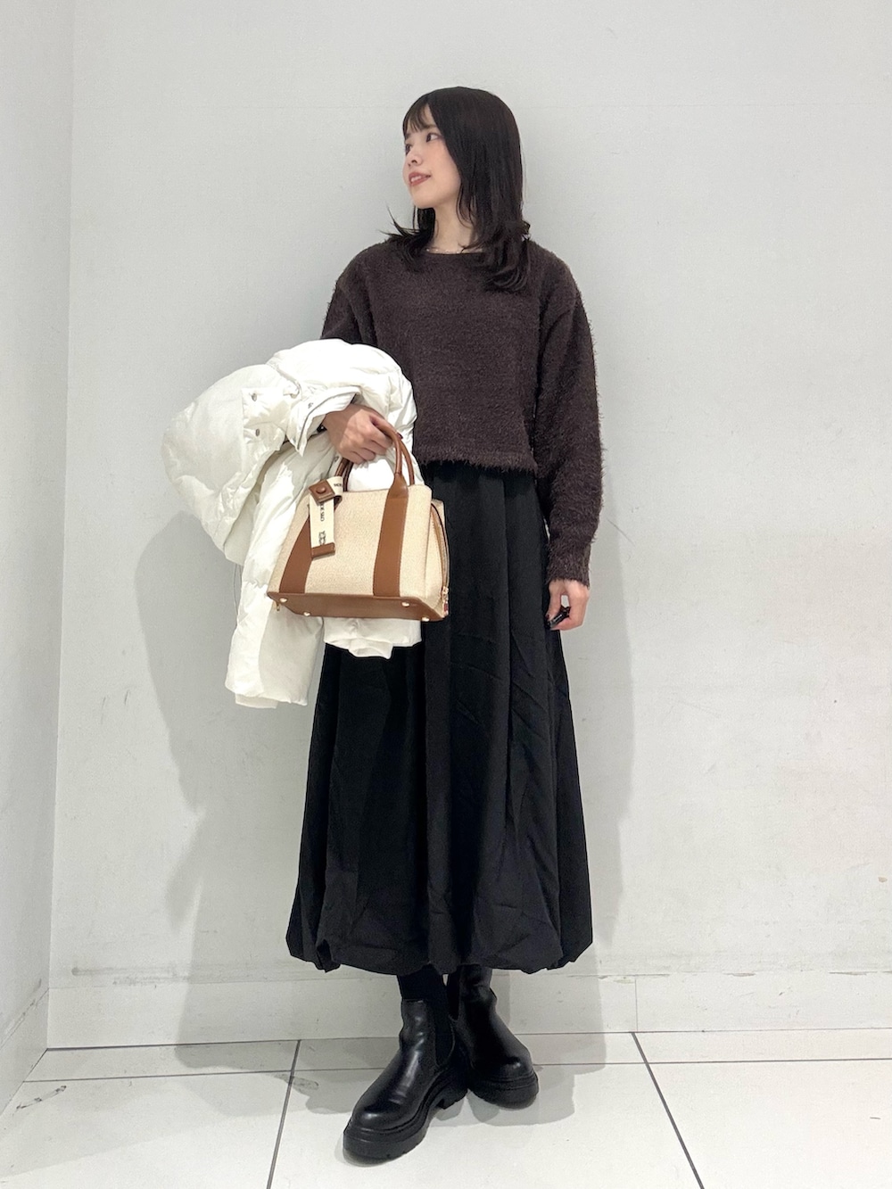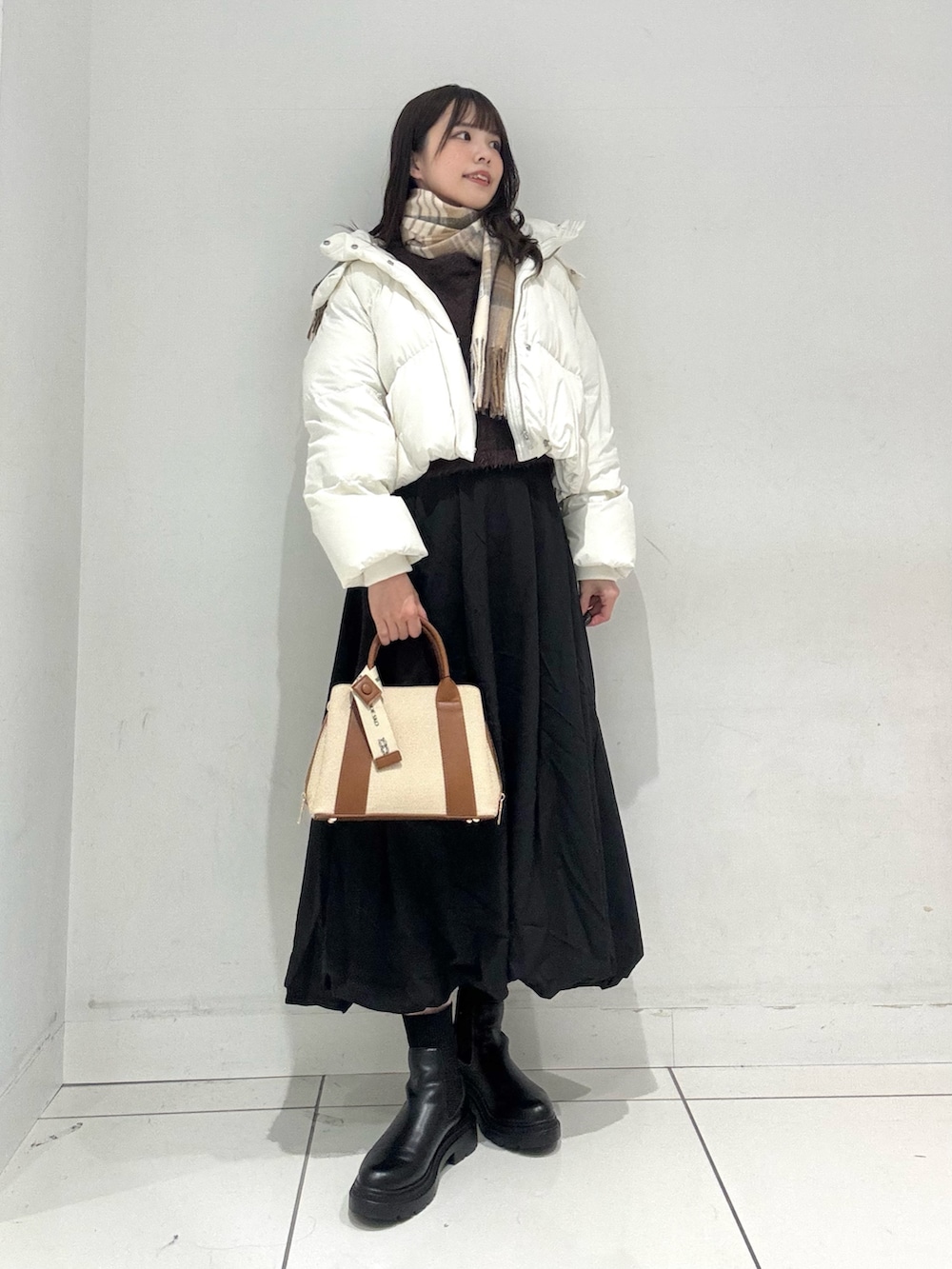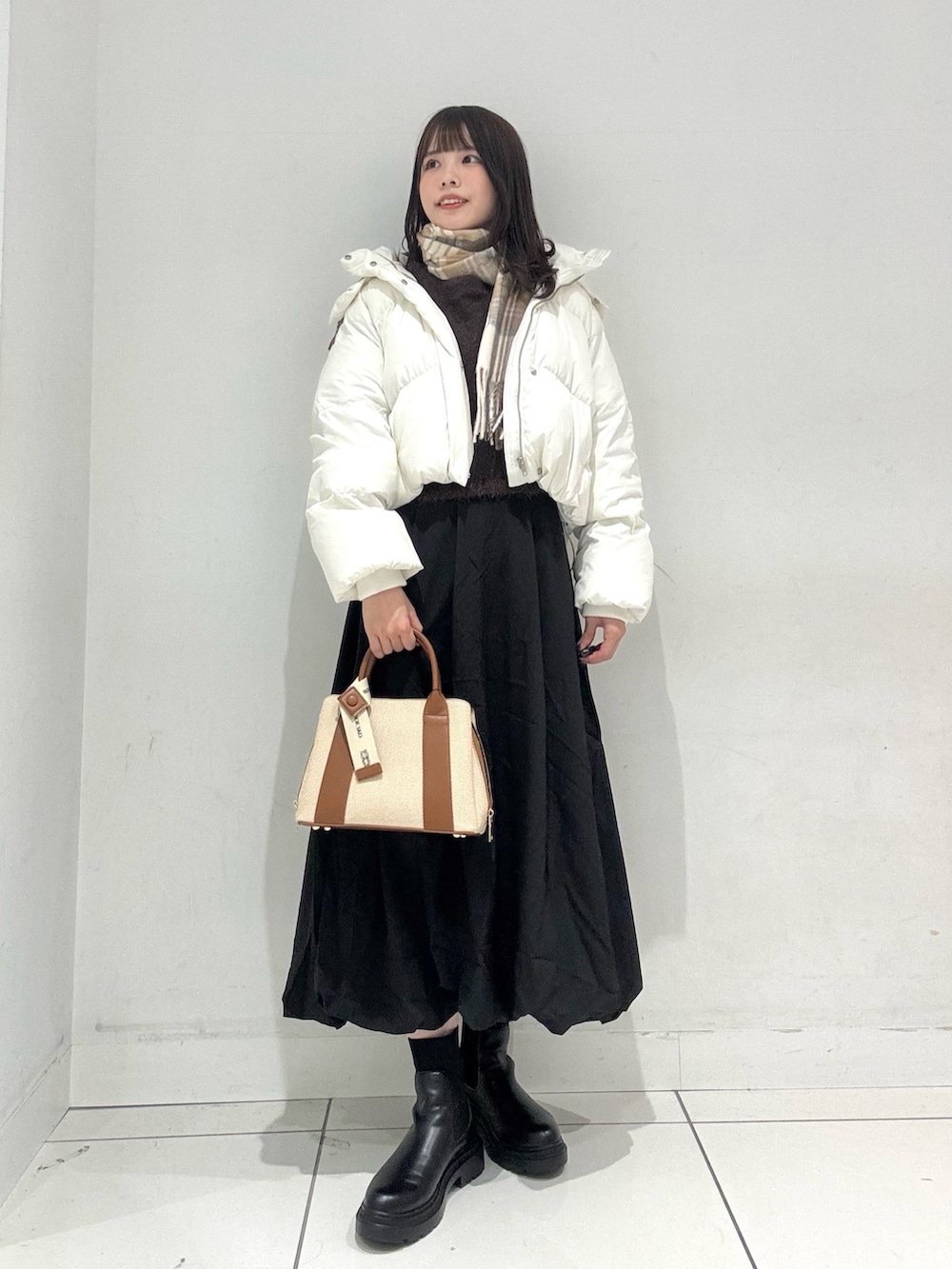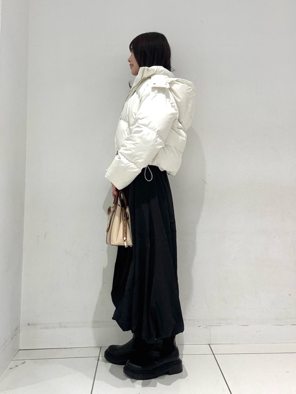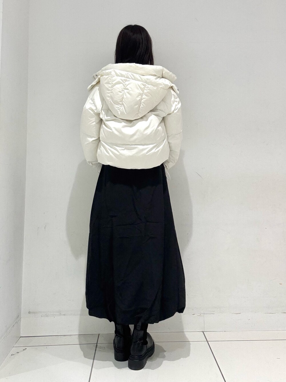 ショートダウンはハイウエストのボトムや、ロングスカートとの相性抜群で、スタイルアップ効果も◎