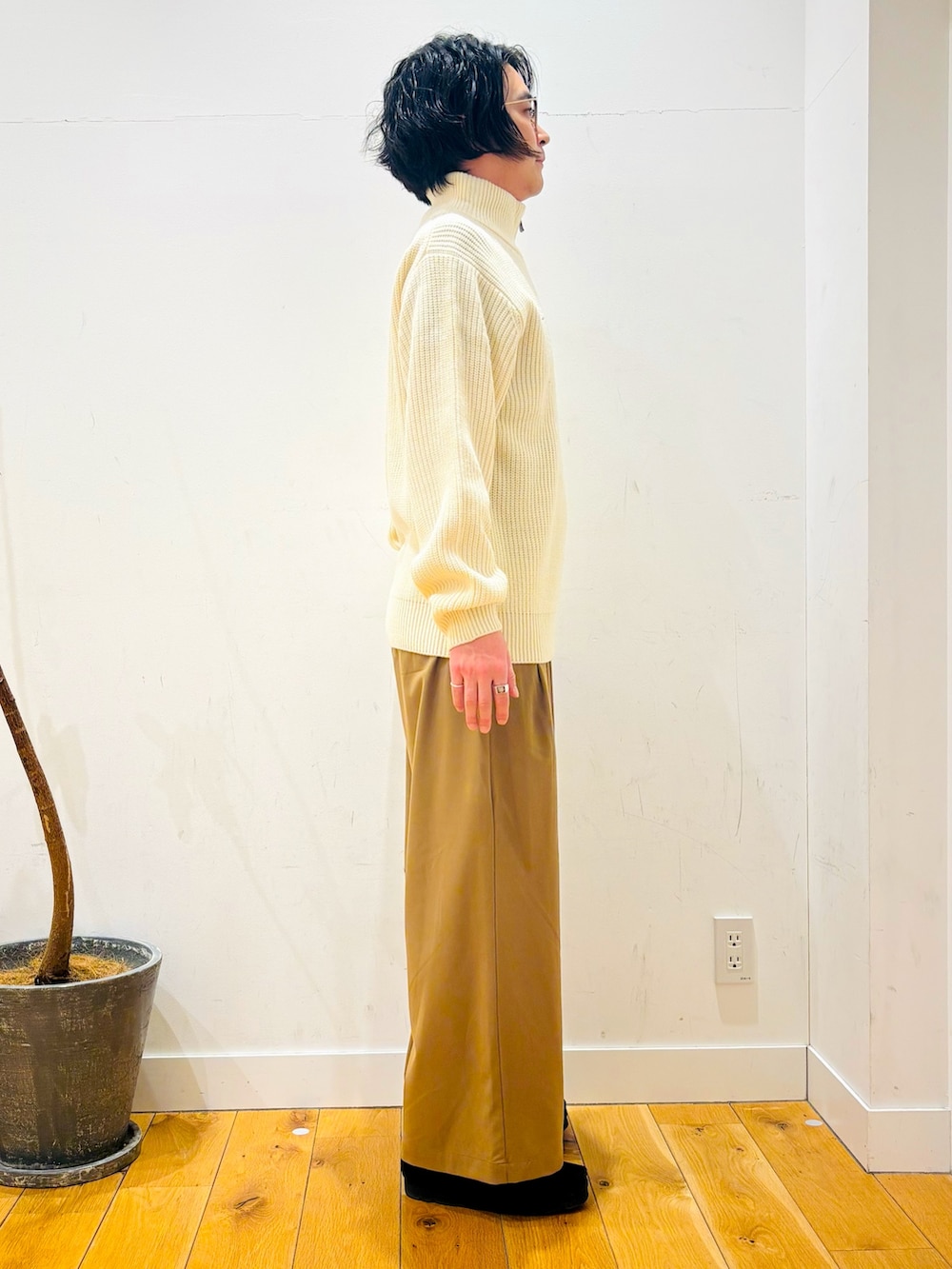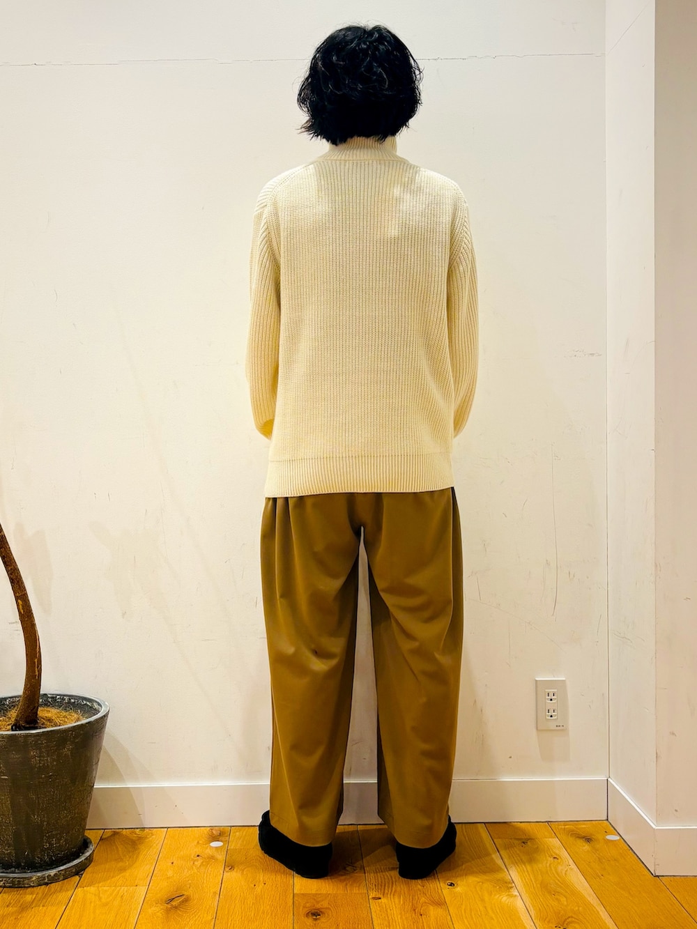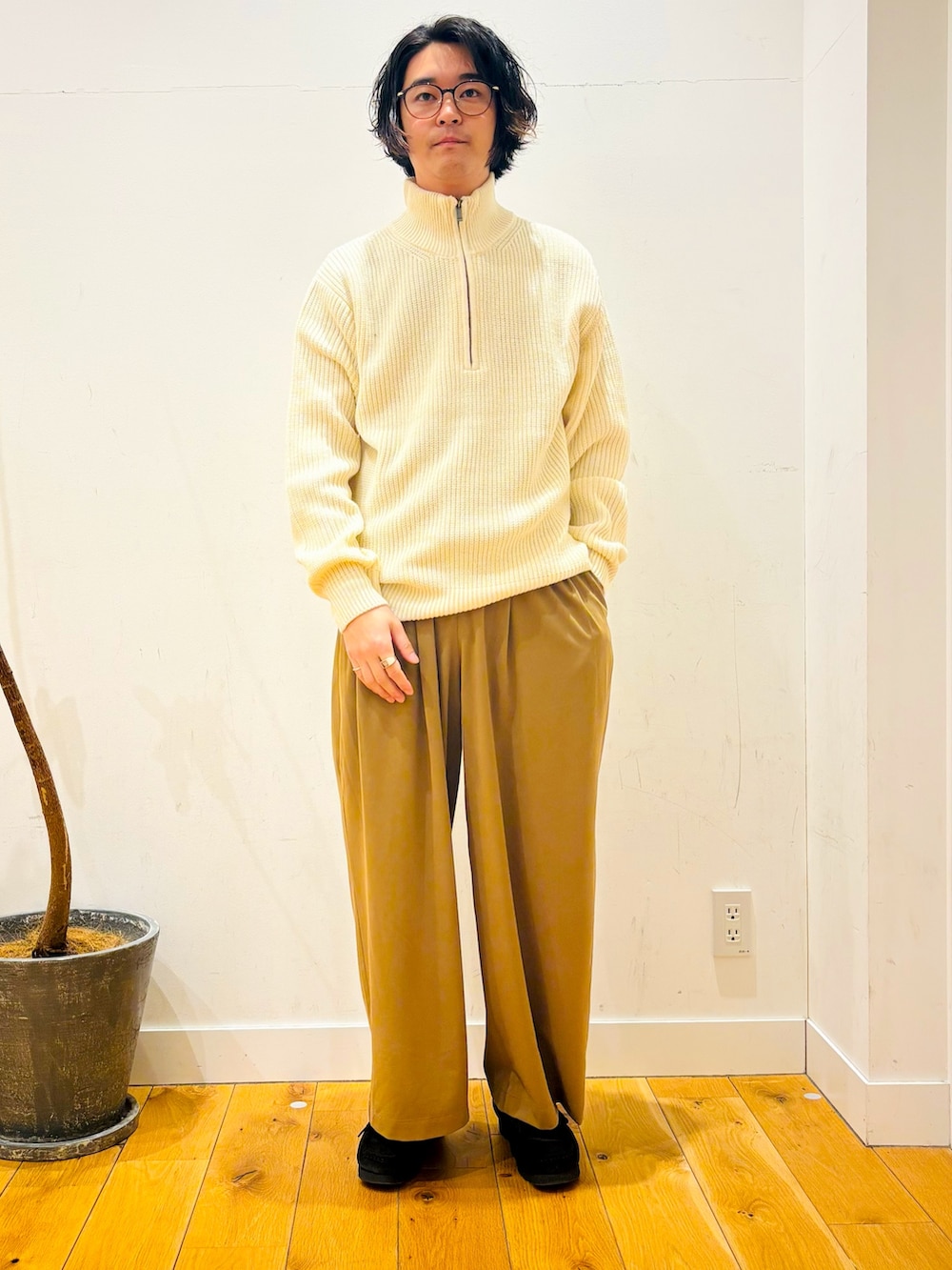 オフホワイトニット+ベージュのスラックス合わせは派手すぎなのでオススメです。