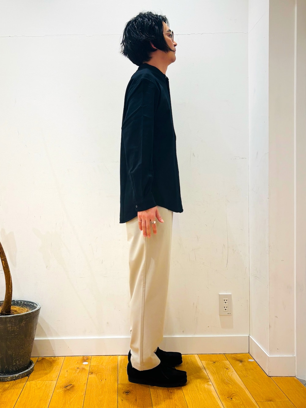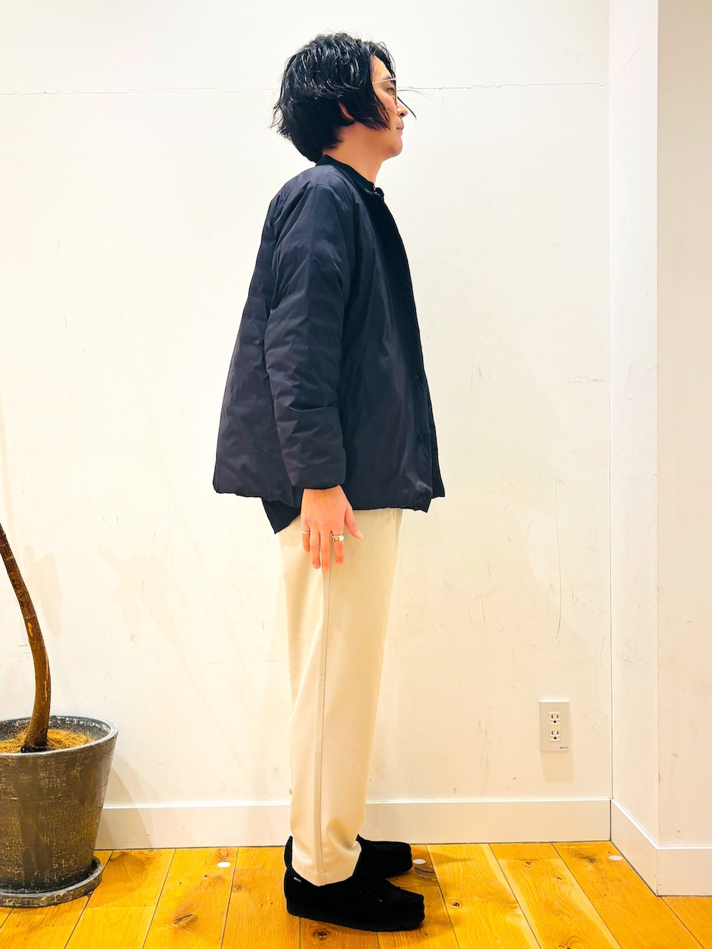 インナーにスウェットやニットも良いですが今回は、シャツで合わせてみました。
