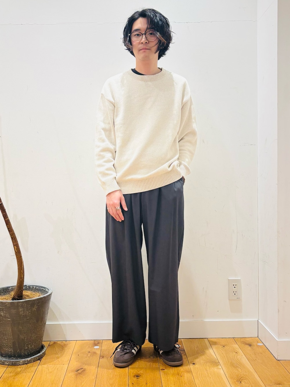 明るいカラーなのでインナーやパンツに暗めのカラーを持ってくると派手すぎないコーディネートになるのでオススメです。