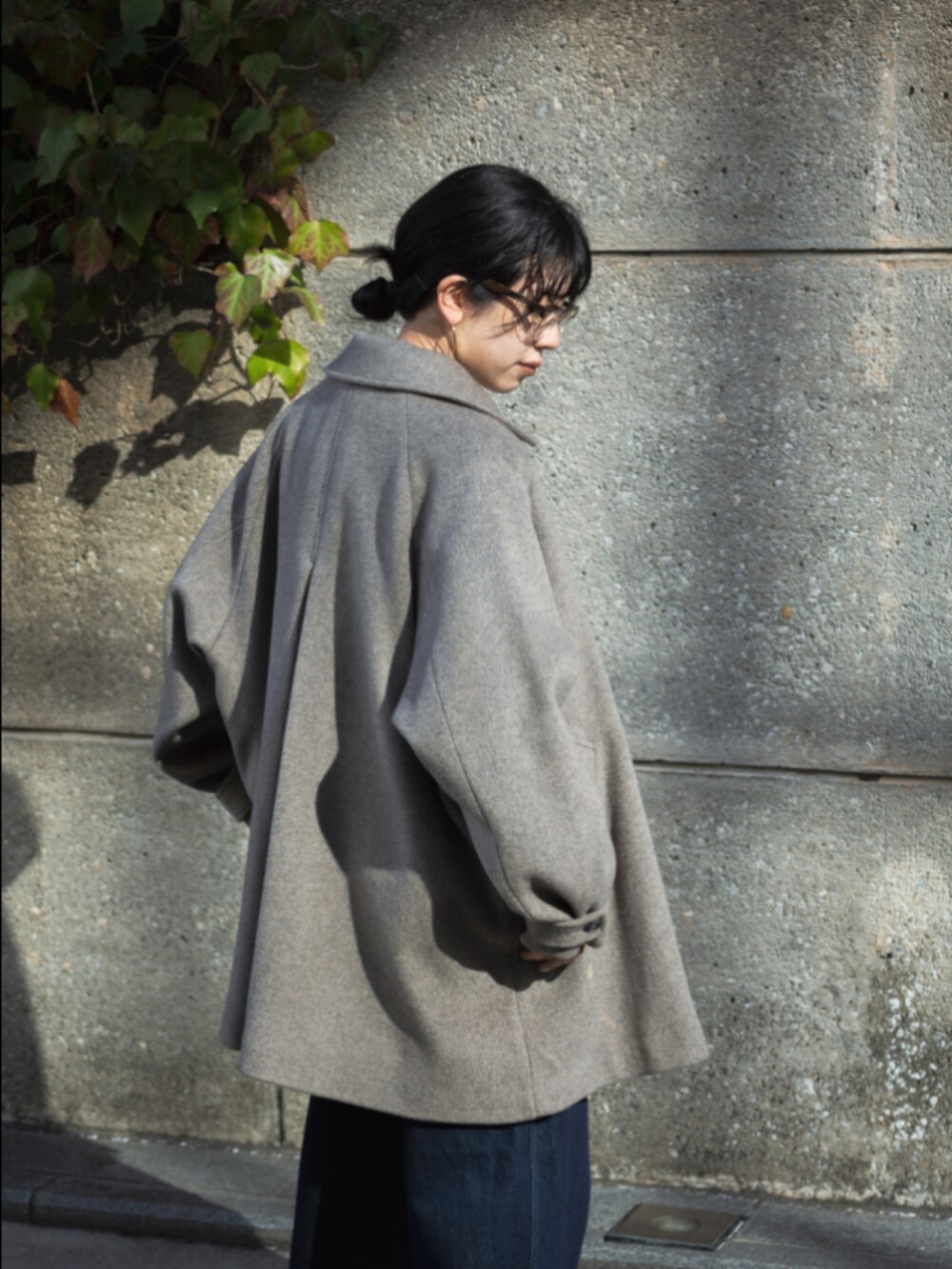 後ろ姿のタックが女性らしいシルエットのショートコート。