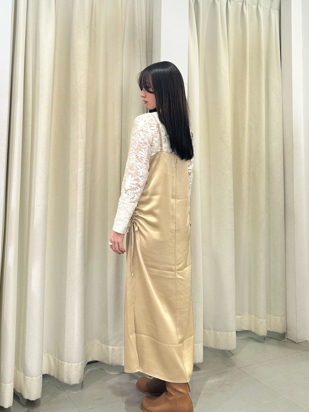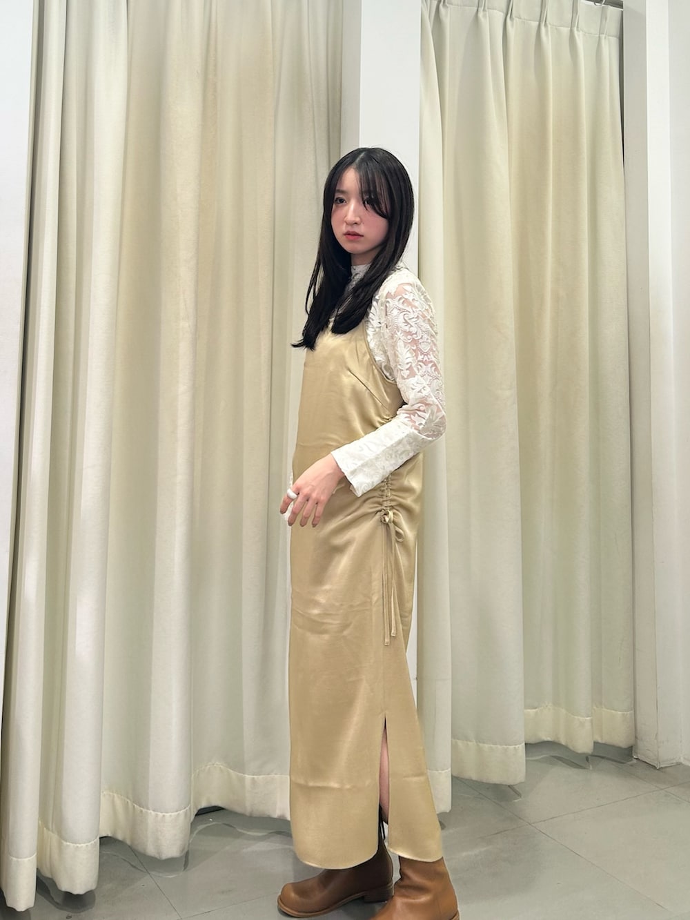 繊細なレーストップスに、光沢のあるベージュのキャミワンピを重ねた女性らしいスタイリング🙂↕️🤍