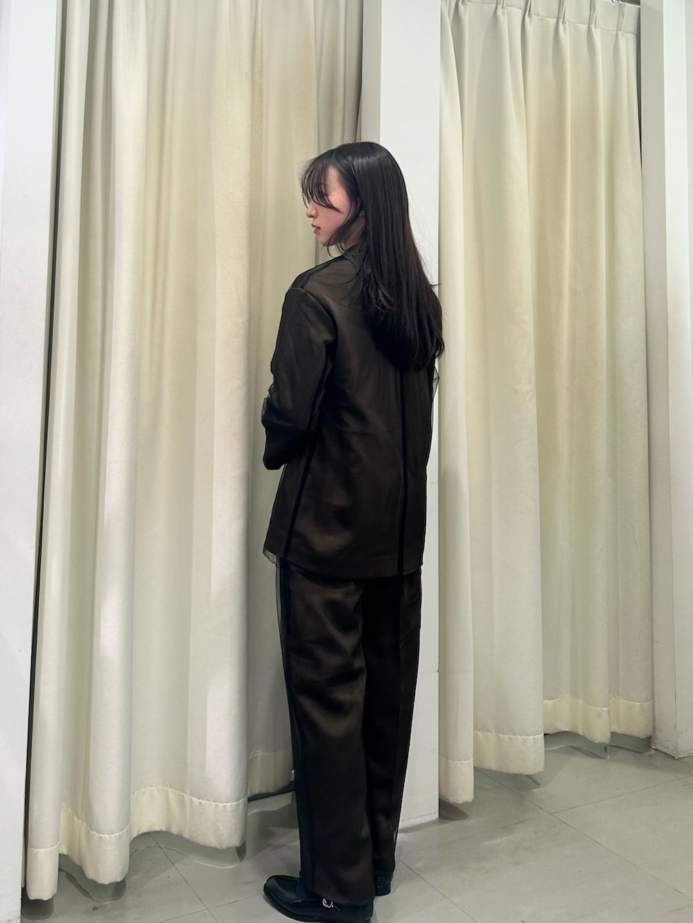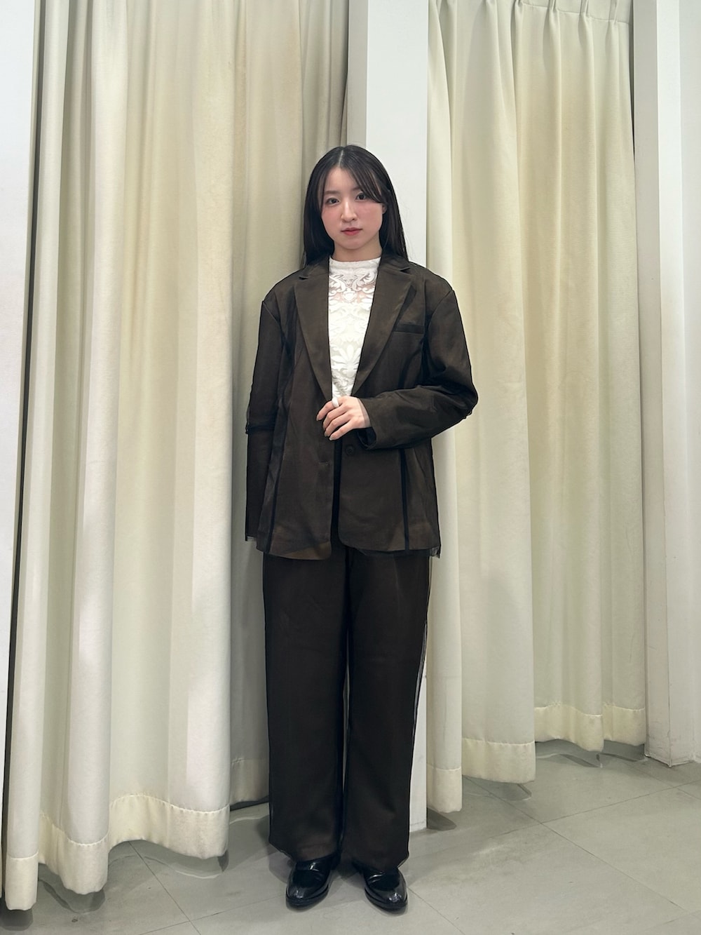 チュールが重なったブラウンのジャケットとパンツのセットアップは落ち着いた色味ながら軽やかに見えます✨