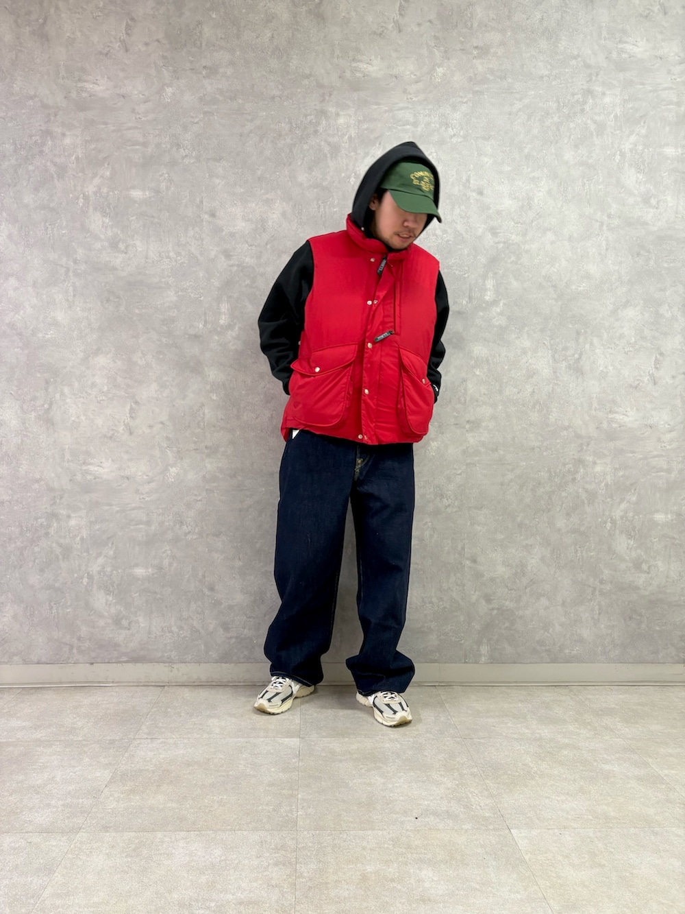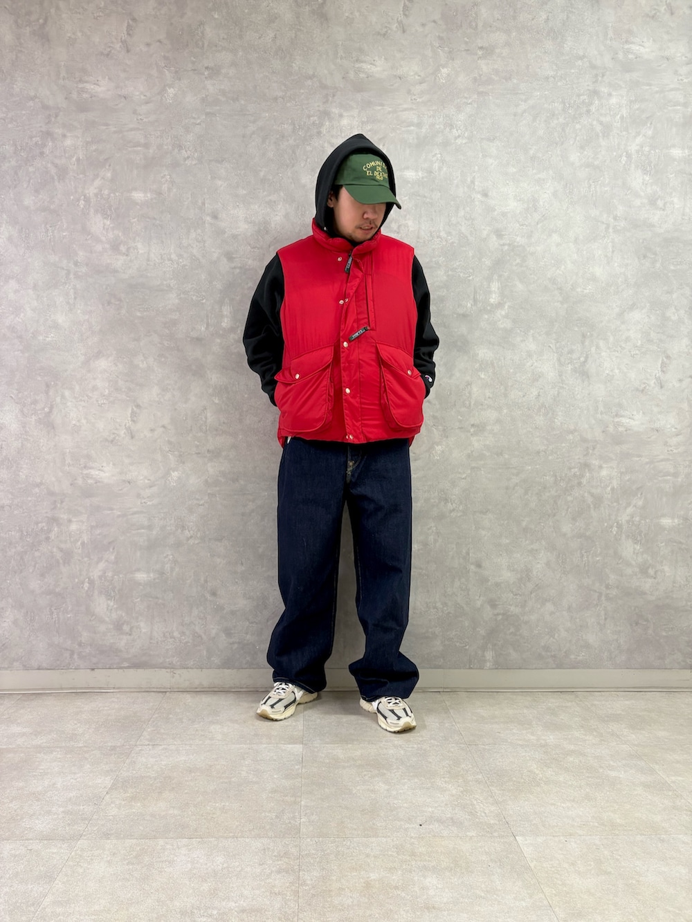 ダウンベストにフーディーをレイヤードしいなたいアメカジコーデを組みました。