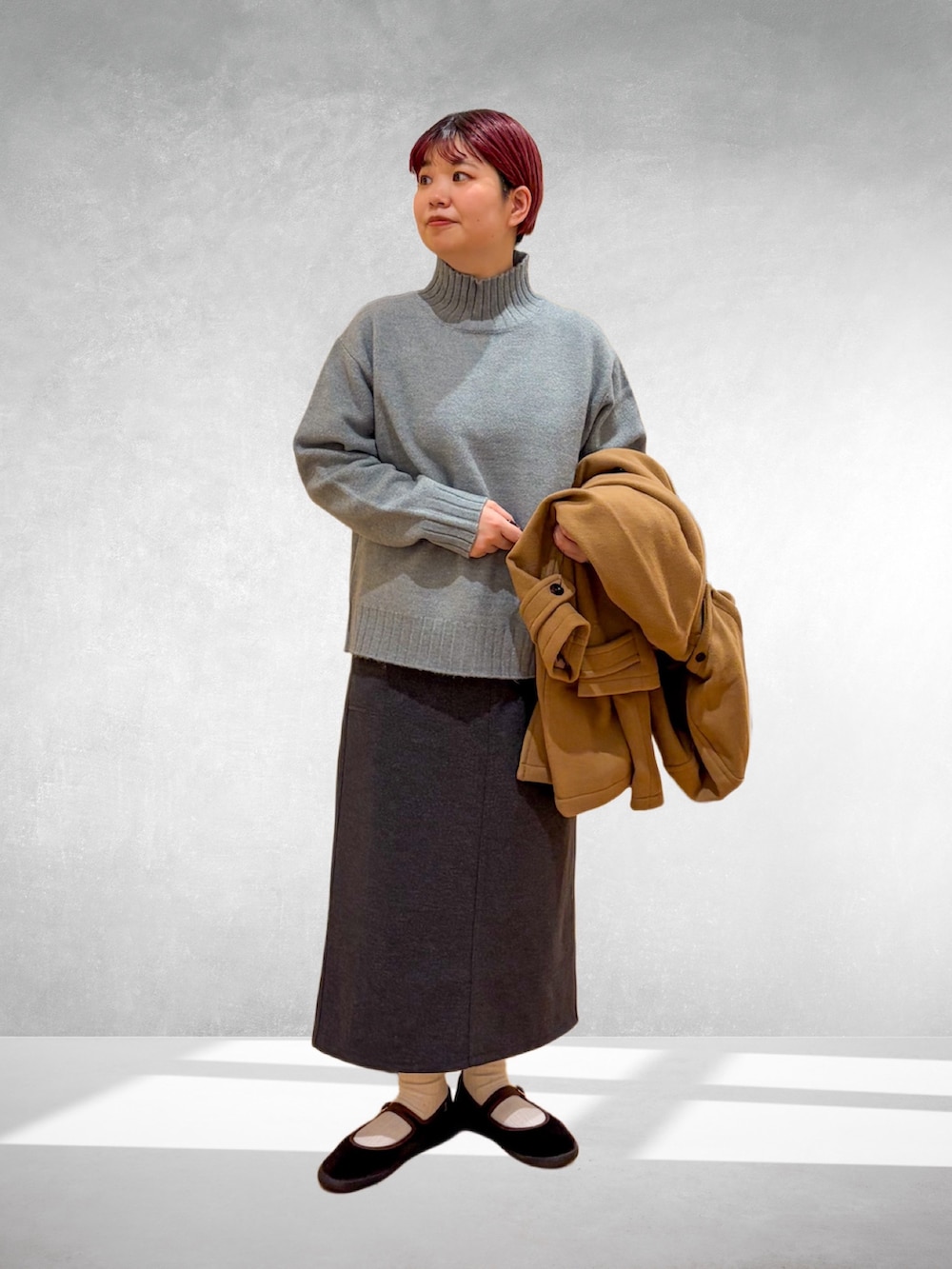 厚手のニットを着用したので、コートはMサイズを着用しました。