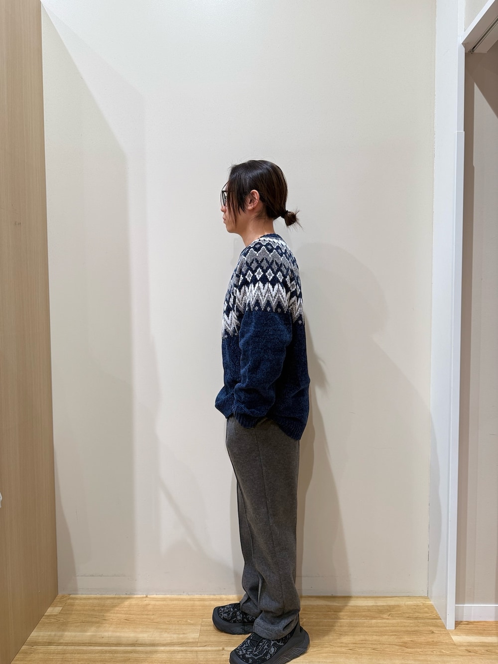 求心柄が主役になる冬コーデ。落ち着いたネイビーベースに、グレースラックスで上品さもしっかりキープ◎