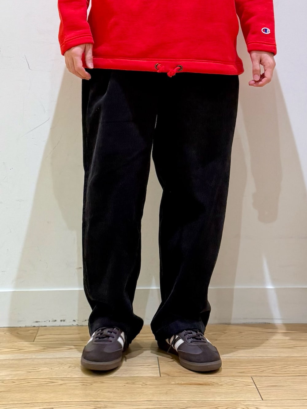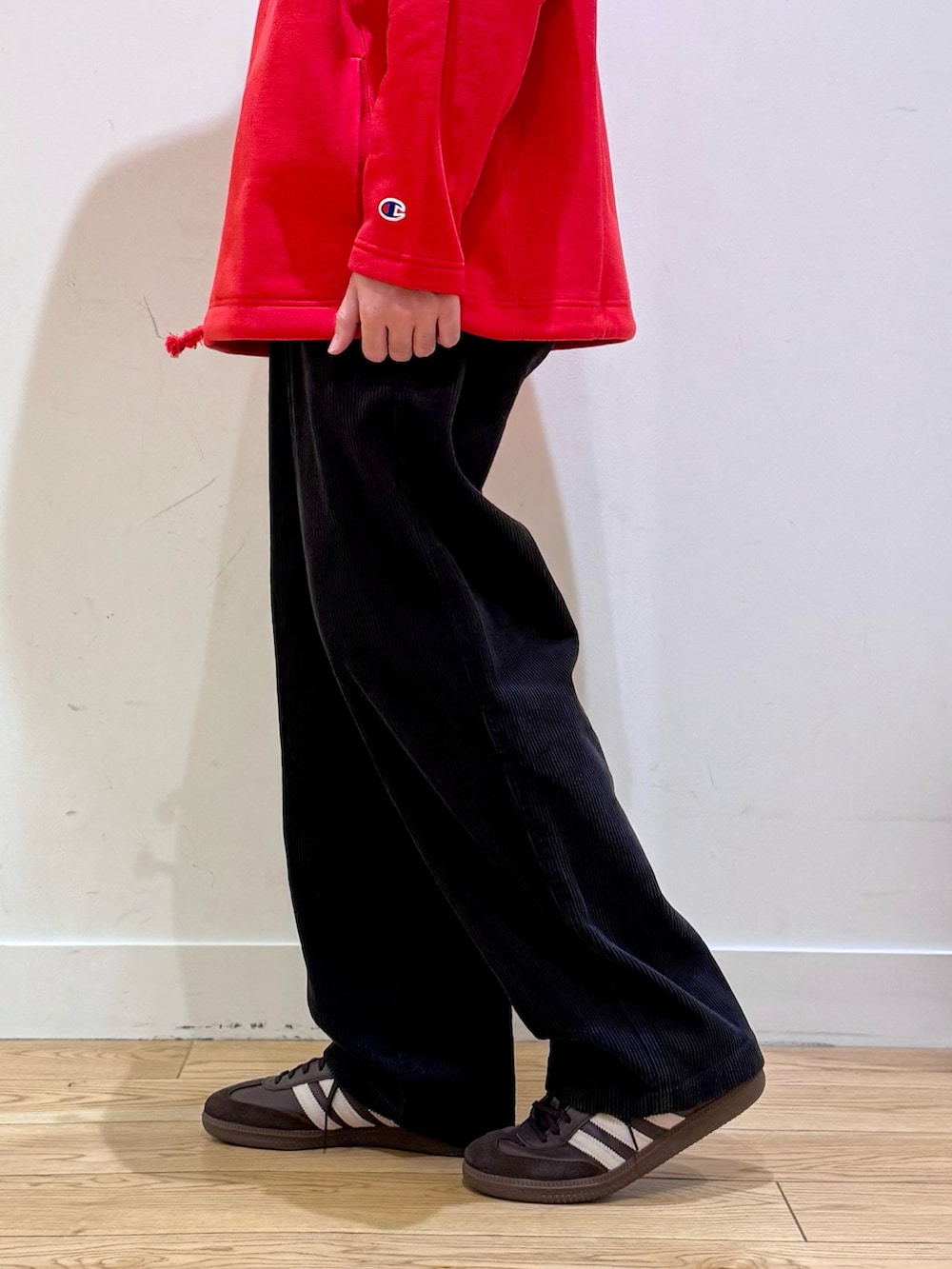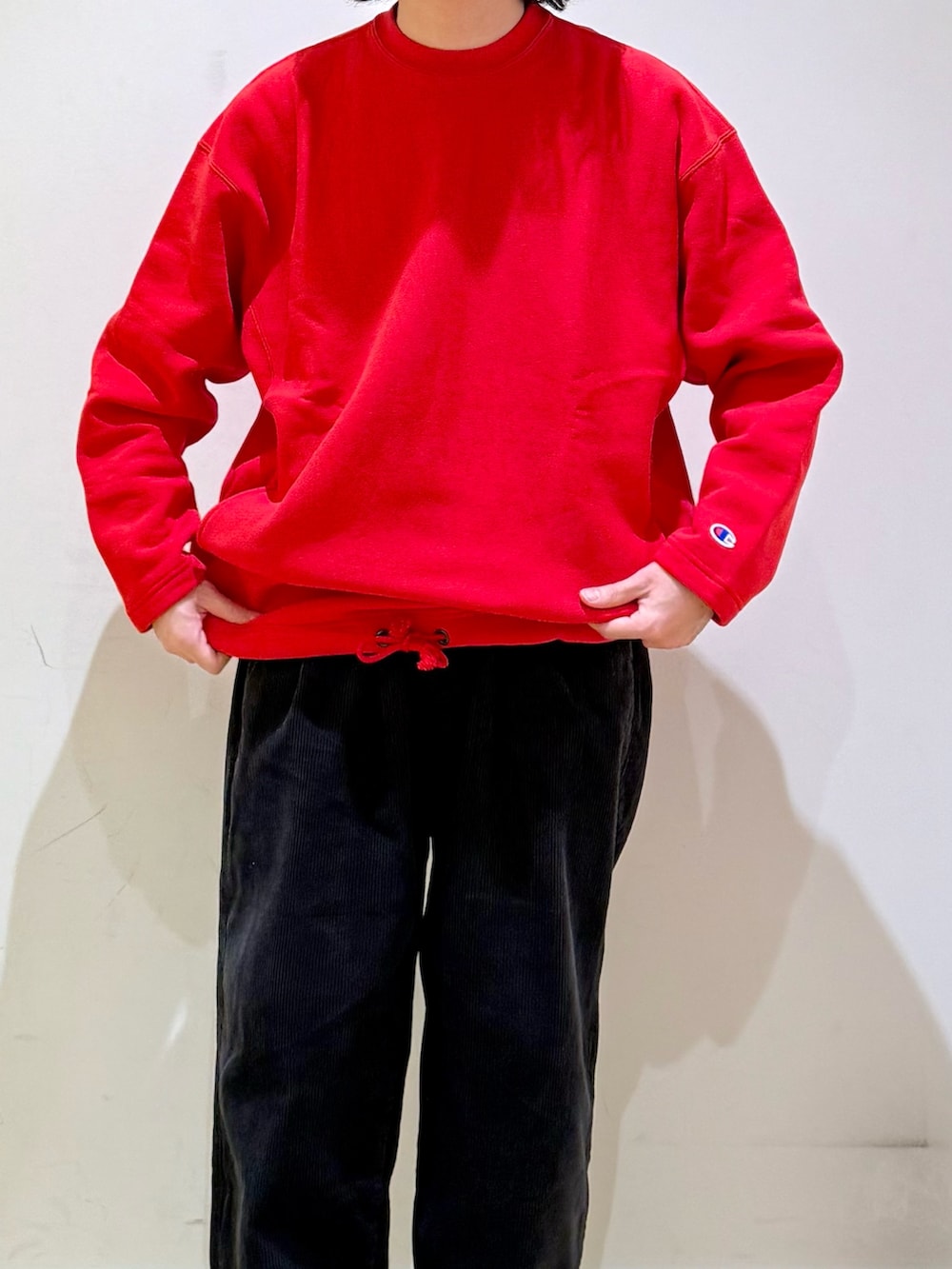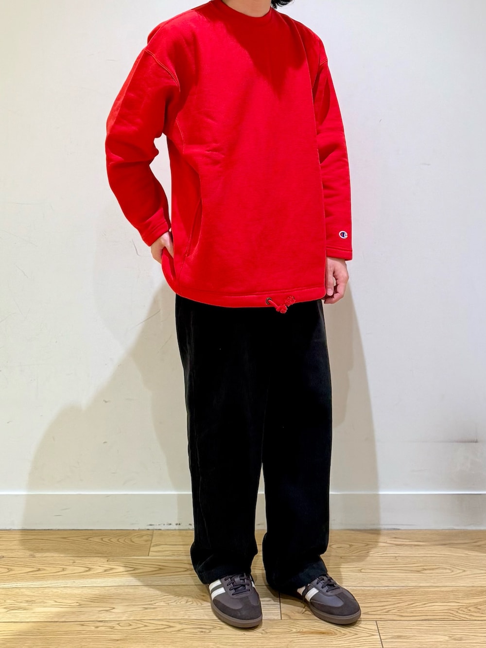 チャンピオンの別注スウェットをメインにコーディネート。