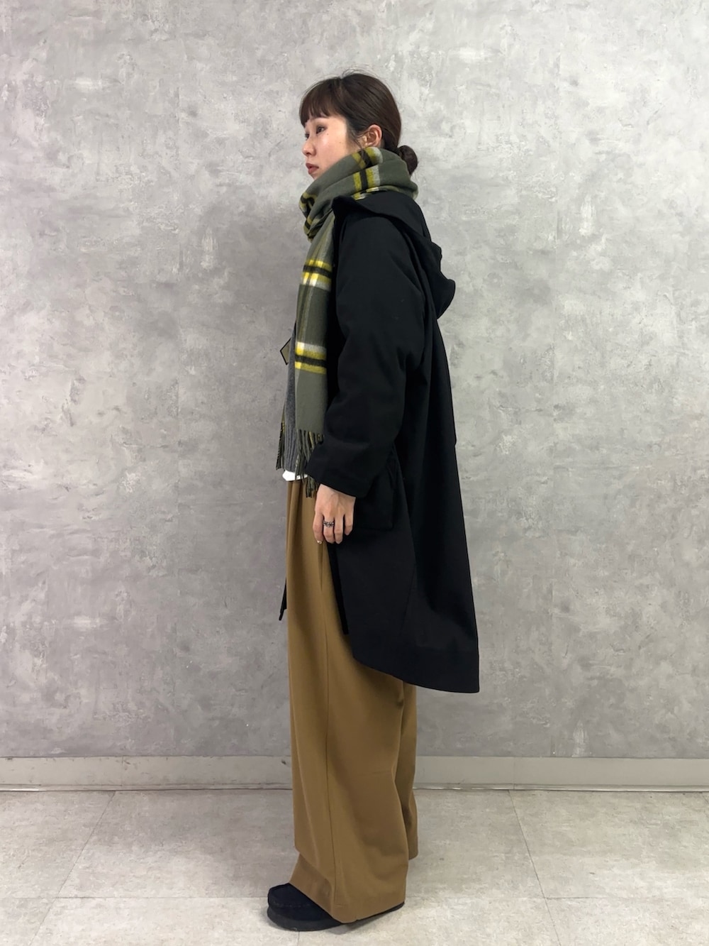 フードがついておりラフなイメージがありつつ、ウールライクな表面感が上品さも持っており、バランスの取れたこなれた雰囲気を与えてくれます♩